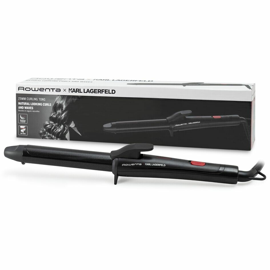 Rowenta X KARL LAGERFELD CF321L Lockenstab CF321L. Typ: Lockenstab, Technologie: Warm, Temperatur (max): 200 °C. Produktfarbe: Schwarz, Rot, Hängeart: Hängeschlaufe, Ursprungsland: China. Kabellänge: 1,8 m. Leistung: 47 W, Energiequelle: AC, Stromverbrauch (Standardbetrieb): 47 W. Maximale Eingangsleistung: 47 W