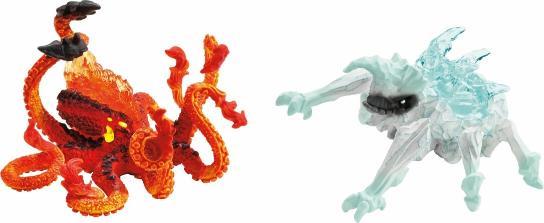 Eiswelt gegen Lavawelt! Gefährlich sieht es aus, wenn der Eiskäfer und die Feuerkrake gegeneinander kämpfen. Wer wohl der Stärkere von beiden ist? Schwer zu sagen, denn beide sehen ziemlich furchteinflößend aus. Der Eiskäfer versucht immer wieder, mit seinen scharfen Krallen nach der Feuerkrake zu greifen. Sie wehrt ihn aber mit lodernden Tentakeln ab. Der Eiskäfer will den vielen Saugarmen ausweichen, denn sie sind heiß wie Feuer und haben dazu noch gefährliche Greifer am Ende. Ein spannender Kampf!