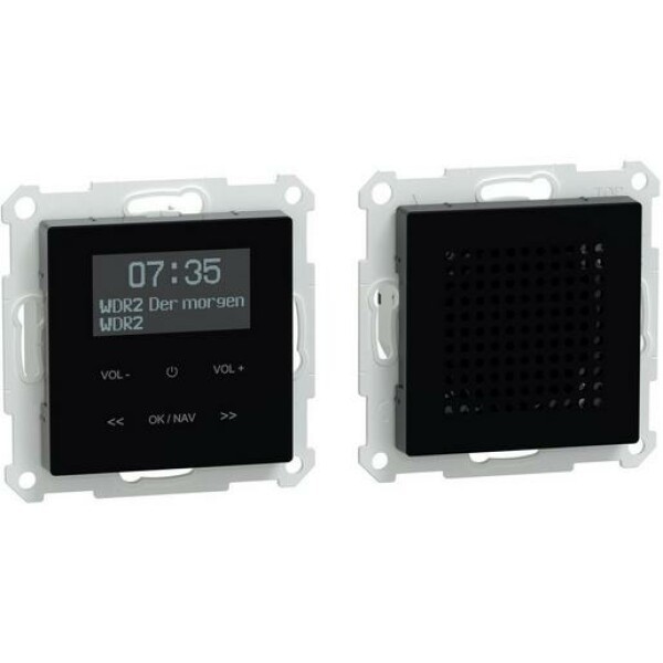 Das Set besteht aus einem UP Radio mit FM RDS und DAB+ Tuner und Bluetoothfunktion sowie einem hochwertigen Lautsprecher. Es kann mit jeden 2-fach Rahmen aus der Familie System M kombiniert werden. Das Set ermöglicht das Abspielen von Playlist oder streamen von Musik über Bluetooth und besistz eine Sensortouchoberfläche. Das Radio besitzt einen Senderspeicher für 20 DAB+ und 20 FM Sender. DAB+ ist effizienter in der Nutzung des Spektrums als analoges UKW-Radio und kann daher mehr Radiodienste für die gleiche gegebene Bandbreite anbieten. Das Produkt verfügt über eine Uhrfunktion mit 2 Weckfunktionen und Sleeptimer. Die Schraubanschlussklemmen ermöglichen einen sicheren Anschluß. Das Produkt kann in handelsübliche Schalterdosen eingebaut werden. Die Abmessungen sind 142mm x 70,8mm x 41,1mm. Die Einbautiefe beträgt 29mm. Die Schutzklasse ist IP20 und IK03 als Schlagschutz.
