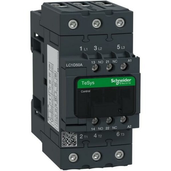 Leistungsschütz TeSys LC1D. 3 polig, 3 Schließer. Zusätzliche Hilfskontakte- 1 Schließer + 1 Öffner, Bemessungsbetriebsleistung bei AC-3, 400 V 22 kW, Bemessungsbetriebsstrom Ie bei AC-3, 400 V 50 A, Spule 230 V AC. Abmessung (BxHxT) 55x122x120 mm, Gewicht 0,855 kg. Kategorie AC-1, AC-4, AC-3. ohne integriertes Beschaltungsmodul. Schnelle und einfache Einrichtung. Sichere und langlebige Stromverbindung mit Everlink und Federklemmen. Geeignet für Sicherheitsanwendungen durch mechanisch gekoppelte Kontakte und Spiegelkontakte. Zertifizierungen nach GL, BV, GOST, CCC, CSA, UL, RINA, LROS (Lloyds register of shipping), DNV. Produktstandards gem.