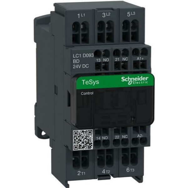 Leistungsschütz TeSys LC1D. 3 polig, 3 Schließer. Zusätzliche Hilfskontakte- 1 Schließer + 1 Öffner, Bemessungsbetriebsleistung bei AC-3, 400 V 4 kW, Bemessungsbetriebsstrom Ie bei AC-3, 400 V 9 A, Spule 24 V DC. Abmessung (BxHxT) 45x80x95 mm, Gewicht 0,48 kg. Kategorie AC-1, AC-4, AC-3. integrierte bidirektionale Amplitudenbegrenzerdiode. Schnelle und einfache Einrichtung. Sichere und langlebige Stromverbindung mit Everlink und Federklemmen. Geeignet für Sicherheitsanwendungen durch mechanisch gekoppelte Kontakte und Spiegelkontakte. Zertifizierungen nach CCC, GL, BV, LROS (Lloyds register of shipping), CSA, RINA, DNV, UL, GOST. Produktstandards gem.