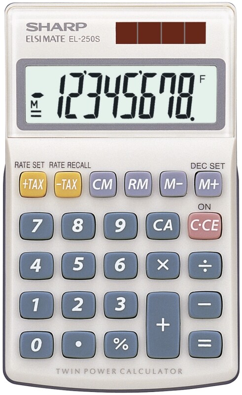 Sharp EL-250S. Formfaktor: Tasche, Typ: Einfacher Taschenrechner. Stellen: 8 Ziffern. Energiequelle: Solar. Produktfarbe: Silber