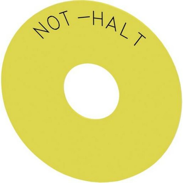Das runde, selbstklebende Unterlegschild ist für die Kennzeichnung von NOT-HALT-Pilzdrucktastern konzipiert. Es ist in gelber Farbe ausgeführt und mit der Aufschrift 'NOT-HALT' versehen, um eine klare und weithin sichtbare Sicherheitskennzeichnung zu gewährleisten. Der Außendurchmesser des Schildes beträgt 75 mm, während der Innendurchmesser 23 mm misst. Das Schild ist Teil des Zubehörs für die SIRIUS ACT Reihe von Befehls- und Meldegeräten.