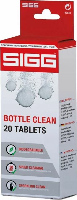 SIGG Bottle Clean Tablets L Reiningungstabletten für SIGG Trinkflaschen. Für die optimale und schonende Reinigung eignen sich die sprudelnden Reinigungstabletten von SIGG ideal. Danach die Flasche offen trocknen bzw. aufbewahren, dann schmecken die Getränke immer und immer wieder frisch. Verpackung enthält 20 Tabs.