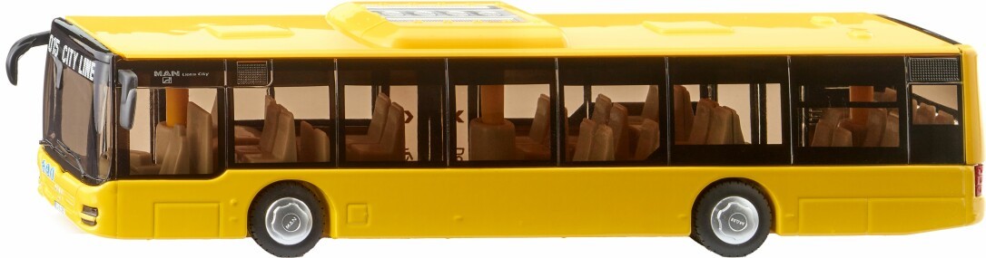 Das sehr aufwändige Busmodell des Originalvorbilds MAN Lions City im Maßstab 1:50 präsentiert sich jetzt in einem markanten gelben Design. Die Details überzeugen durch Räder mit gummierten Laufflächen, Zwillingsbereifung sowie zwei Türen an der rechten Fahrzeug-seite, die sich öffnen lassen. Gleiches gilt für die Motorklappe im Heck. Die getönten Scheiben, separaten Rückspiegel und der eingesetzte Kühlergrill verleihen dem Modell eine authentische Optik. Die Leuchten vorne und hinten aus Kunststoff sowie der Dachaufbau mit Klimaanlage runden das hochwertige Erscheinungsbild ab.