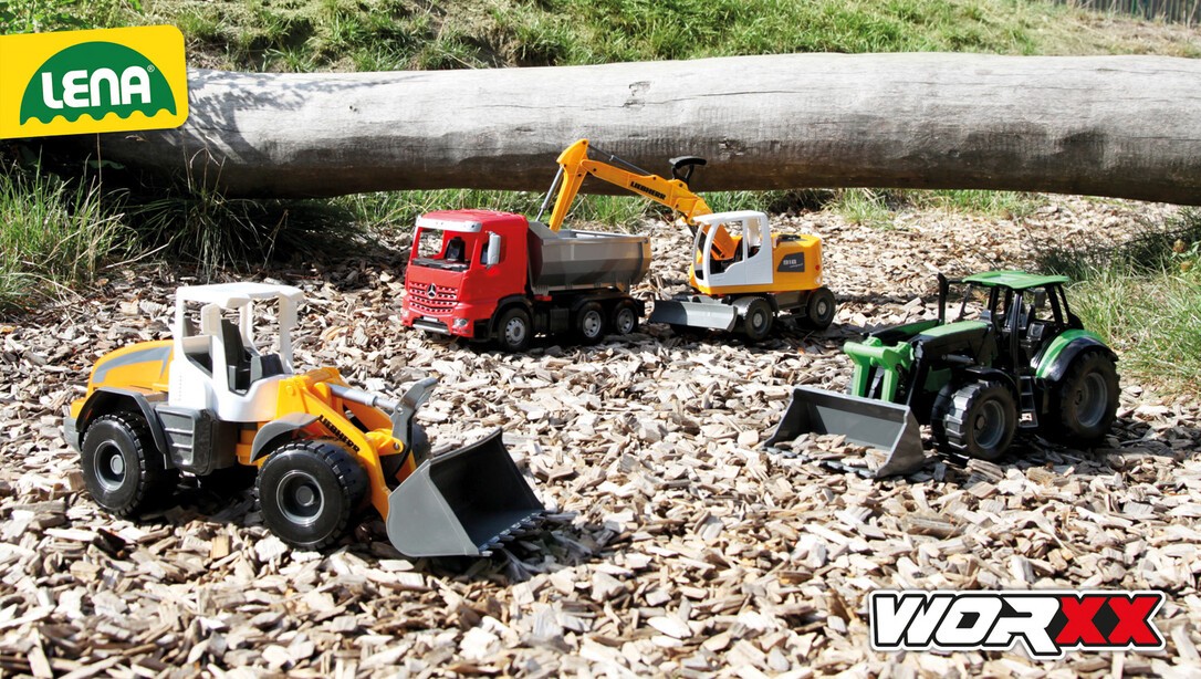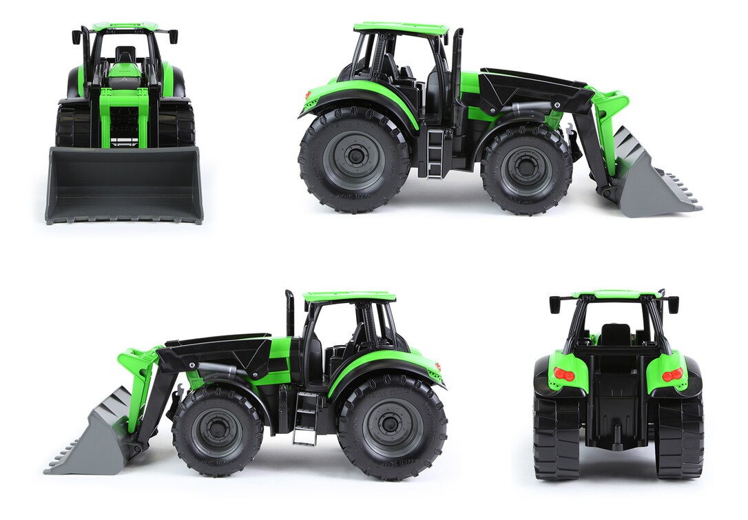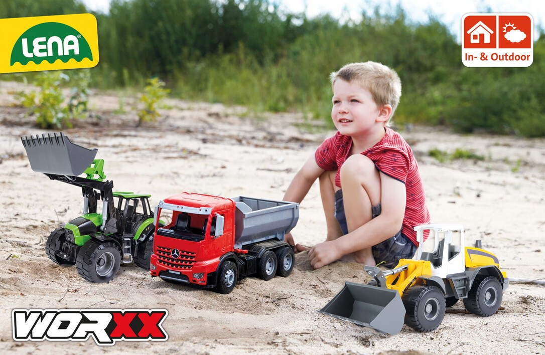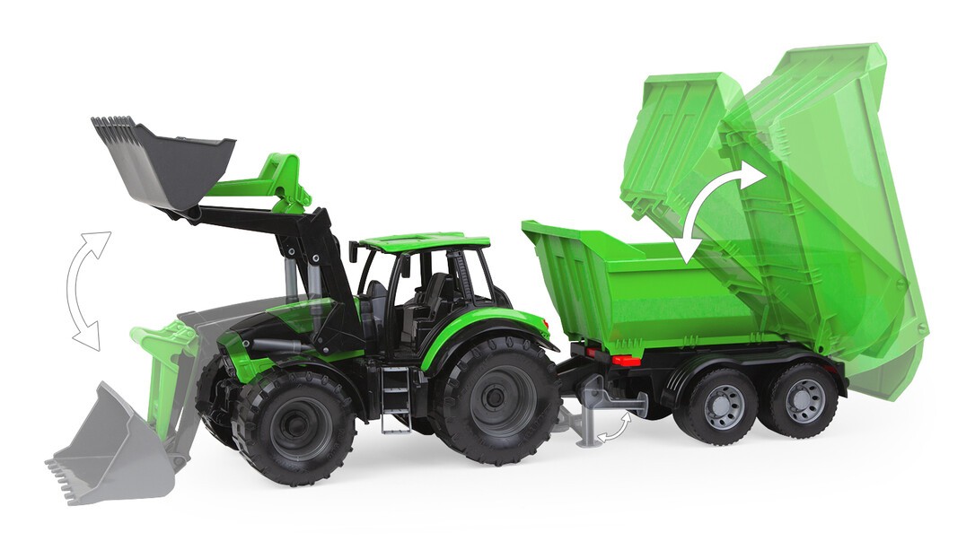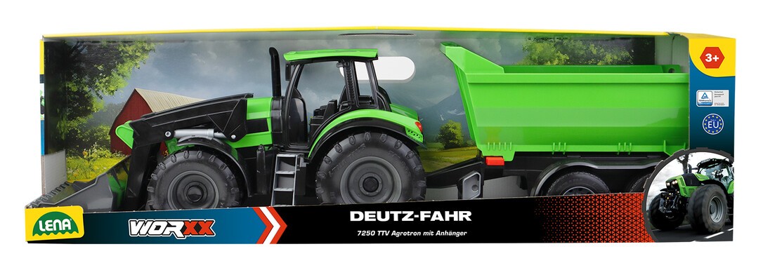 LENA® WORXX Traktor Deutz-Fahr Agroton 7250 TTV mit Anhänger. 5 mm verzinkte Stahlachsen. Verstellbare und arretierbare Traktorschaufel und Traktorarm. Verriegelbare Kippmulde mit Heckklappe. Ca. 74 cm. Indoor & Outdoor geeignet. Für Kinder ab 3 Jahren. Verpackt in buntem Schaukarton. MADE IN EUROPE.
