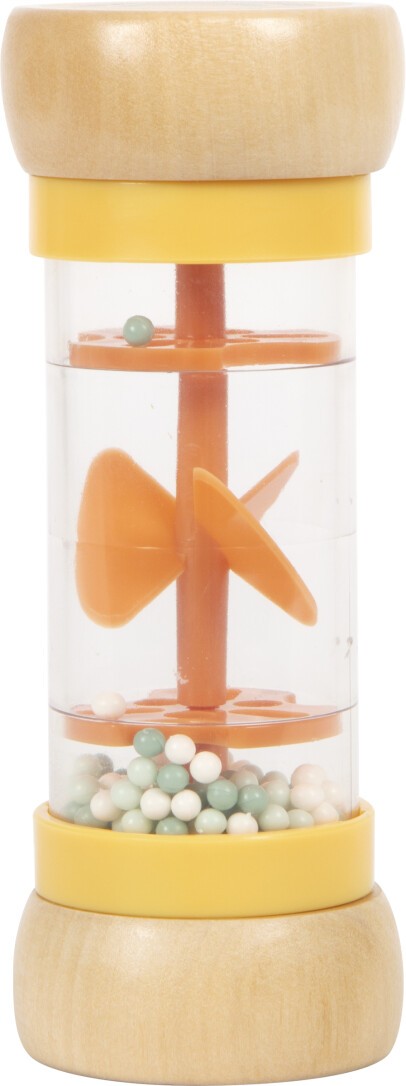 Dem Rasseln des Regens lauschen! Mit diesem Regenmacher aus Holz im angesagten „Safari“-Look lassen sich die sanften Klänge des Regens nachahmen, während der transparente Kunststoffkolben freie Sicht auf die herabrieselnden Kügelchen gewährt, die beruhigend durch die Lochplatten rieseln und den rotierenden Propeller in der Mitte in Bewegung setzen. Für Babys und Kleinkinder sowohl visuell als auch akustisch ein faszinierendes Sinnesspielzeug, das die Wahrnehmung schult und langanhaltenden Spielspaß verspricht. Das Rhythmus- und Klangspielzeug ist auch als Rassel und Spielzeug zum Rollen geeignet. Dank des handlichen Formats ist die Regenrassel außerdem ideal für Kinderhände zu greifen und perfekt für unterwegs geeignet.