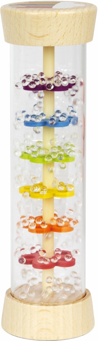Regenmacher ''Regenbogen''. So klingt der Regen! Mit diesem Regenmacher lassen sich sanfte Regentöne imitieren. Vielseitig einsetzbar als Rassel, Rhythmusinstrument, Klangspielzeug oder beruhigendes Sinnesspiel zieht er nicht nur Kinder in seinen Bann. Der transparente Kunststoffkolben des Regenstabs gewährt freien Blick auf Kügelchen in Glasoptik, die durch die sechs farbigen Lochplatten in Blümchenform rieseln. So wird Akustik und visuelle Wahrnehmung geschult. Auch als Rassel und Spielzeug zum Rollen für Babys und Kleinkinder geeignet.