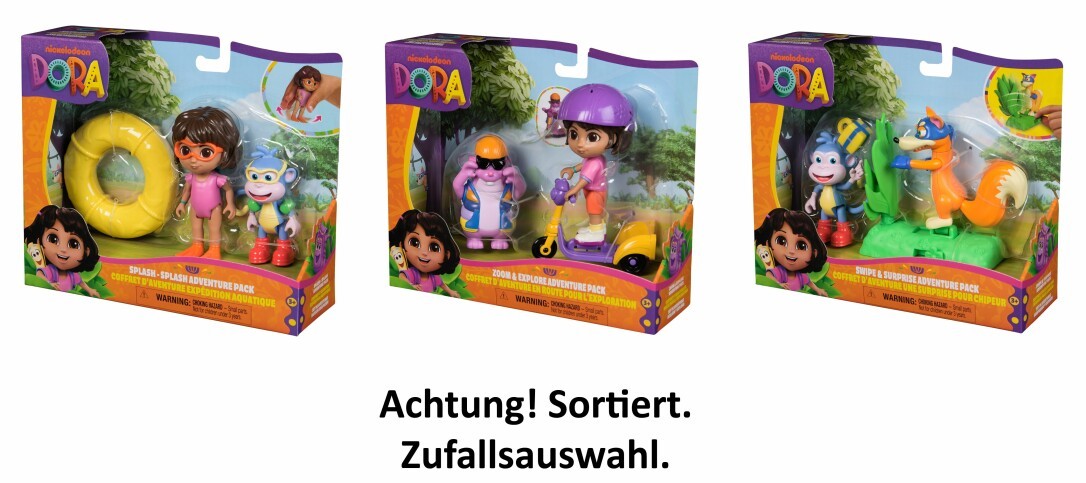 Die Abenteuer Packs sind ein toller Einstieg in die farbenfrohe, exotische Welt von Dora, die als TV-Heldin in der gleichnamigen Animationsserie Kinder seit mehr als 25 Jahren begeistert. In der Serie werden Kinder nicht nur mit einer anderen Kultur vertraut, sondern lernen durch den bilingualen Ansatz auch erste Worte in Englisch. Wer die Serie liebt, möchte natürlich auch seine Lieblingscharaktere als Spielfiguren haben, um die Szenen immer wieder nachzuspielen und eigene fantasievolle Abenteuergeschichten zu erfinden. Da die Abenteuer Packs gleich zwei Figuren sowie ein großes Accessoire enthalten, kann der Spielspaß gleich beginnen. Die Sortierung umfasst drei verschiedene Sets: Dora als Schwimmerin mit Flossen, Schwimmring und Affenfreund Boots, Dora mit Roller und Eichhörnchen Tico sowie Affe Boots und Fuchs Swiper mit Guck-Guck-Busch. Jedes Set bietet eine überraschende Bewegungsfunktion, die zusätzlichen Realismus ins Spiel bringt. Die Figuren sind vom Maßstab her mit den Dora und Freunde Set, dem Fantastische Freunde Geschenkset sowie mit dem Casita Spielset (alle separat erhältlich) kompatibel. So können Kinder alle Charaktere sammeln und die Abenteuer nehmen von der Casita aus, dem Zuhause von Dora und ihrer Familie, ihren Lauf.