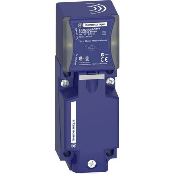 Induktiver Näherungsschalter OsiSense XS8. Bauform 40 x 40 x 117, Schaltabstand Sn 20mm. 12-48DC, Schraubklemmen, Gehäusematerial PBT. Würfel- bzw. quaderförmige Sensoren aus Kunsstoff mit aktiver Fläche in 5 Positionen schwenkbar. IP67 entspricht IEC 60529.