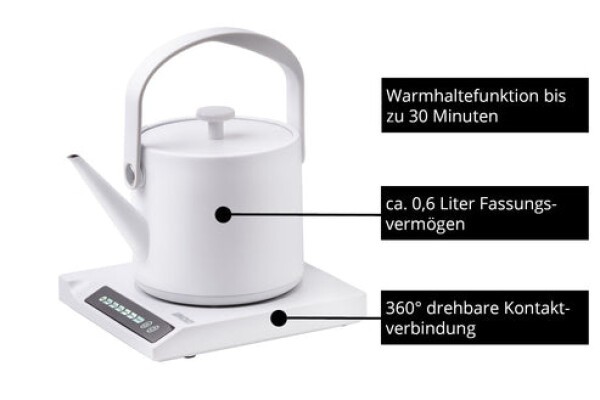 Unold Clara. Fassungsvermögen Wassertank: 0,6 l. Leistung: 1000 W. Produktfarbe: Weiß, Gehäusematerial: Kunststoff, Edelstahl, Regelbare Temperatur. Drahtlos. Warmhaltefunktion