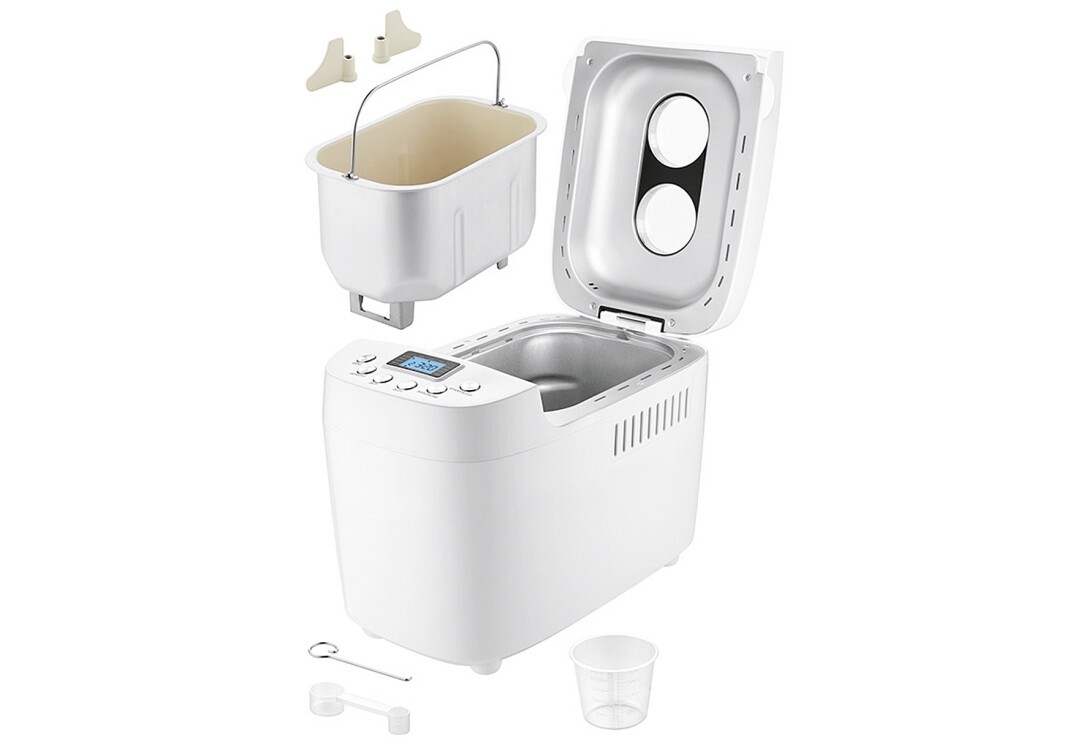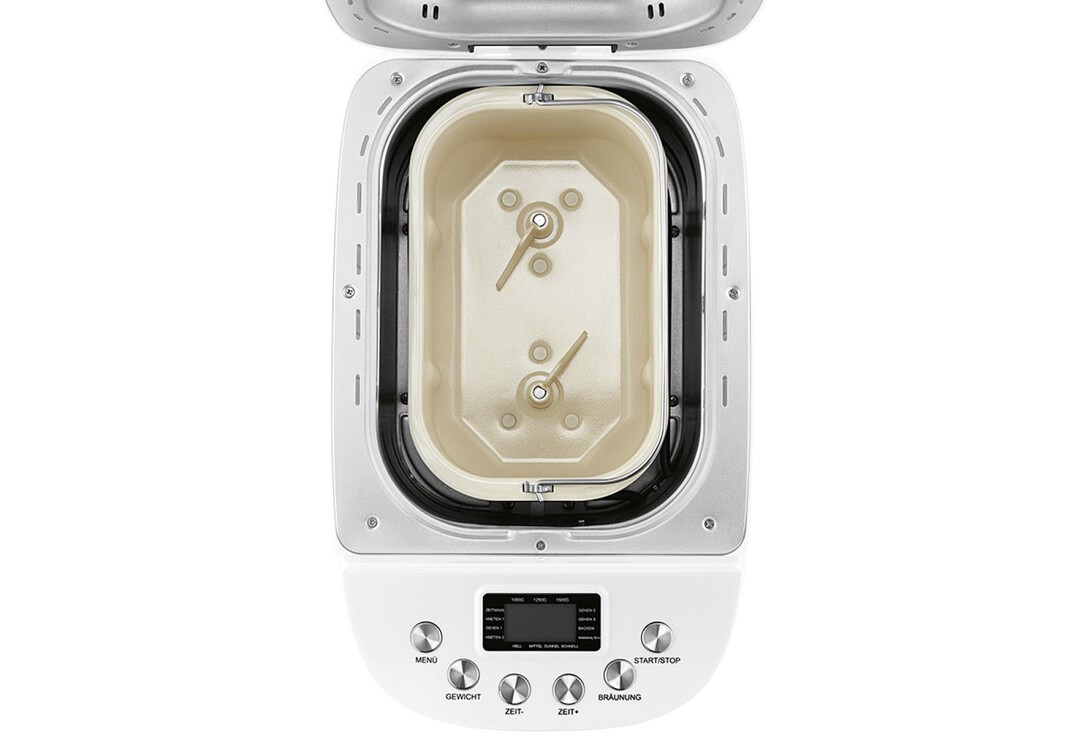 Der BPA-freie BACKMEISTER Big White bietet 15 gespeicherte Programme für Brote (auch glutenfrei), Marmelade/Konfitüre, Kuchen, Nudelteig oder Joghurt. Mit dem leistungsstarken, robusten AC-Motor sind so u.a. 3 Brotgrößen und 3 Bräunungsgrade mach- und wählbar – für die entnehmbare Backform und den Doppelkneter (beide keramisch antihaftbeschichtet). Sicher auf Antirutschfüßen stehend, bis zu 15 Stunden vorprogrammierbar und mit viel Zubehör: Messbecher und -löffel, 2 Kneter, 1 Hakenspieß, entnehmbare Backform und Bedienungsanleitung mit Rezepten.