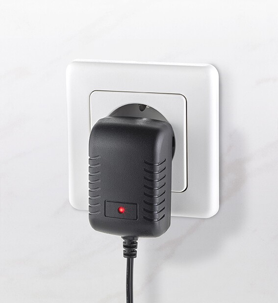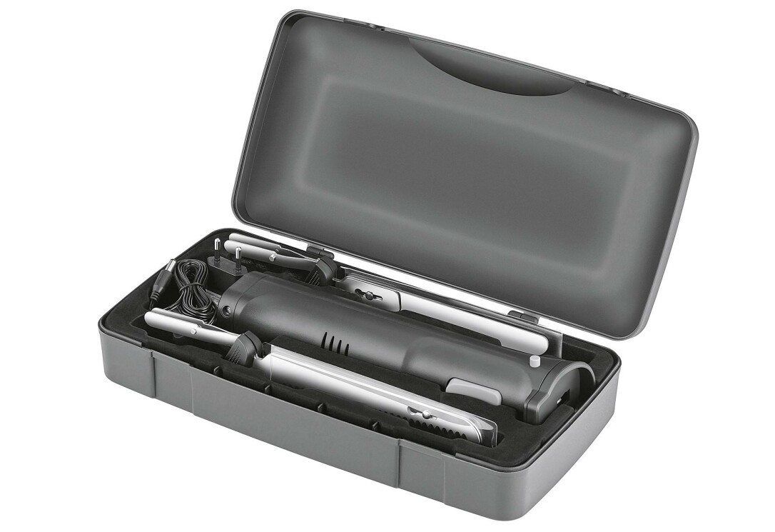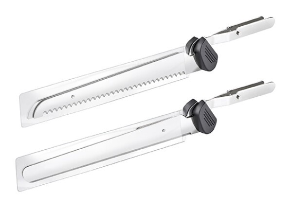 kabelloses Elektromesser mit zwei austauschbaren Edelstahl-Messern (ein Messer mit gezahnter Doppelklinge und ein Glattes), Sicherheitsschalter: 2 Fingerbetrieb für mehr Sicherheit, Akkuladezeit 90 min (Li-Ion-Akku), Steckernetzteil mit Ladeanzeige, Leistung 9 Watt