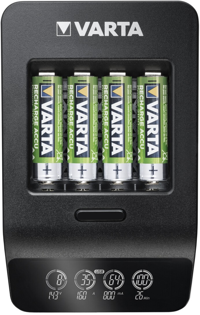 Ladegerät, LCD Smart+, kann mit den beiden verschiedenen Modi nicht nur aufladen, sondern auch NiMH-Akkus auffrischen, deren Kapazität im Laufe der Nutzungsdauer abgenommen hat. Die Einzelschachtladung erlaubt das gleichzeitige Laden zu unterschiedlichsten Kombinationen - bezüglich Anzahl, Ladezustand, Kapazitäten und Baugrößen der Akkus. Das Gerät erkennt fehlerhafte, ungeeignete oder falsch eingelegte Akkus. Defekte Zellen werden nicht geladen und beschädigen daher das Ladegerät nicht. Die Temperatur der Akkus wird während des Ladevorgangs gemessen. Überschreitet die Temperatur einen bestimmten Wert, schaltet sich das Gerät automatisch aus. Die Ladezeit beträgt 1,5 Stunden und die große und einfache LCD-Anzeige bietet höchsten Komfort. Zusätzlicher USB-Ausgang ermöglicht es externe Geräte zu laden.