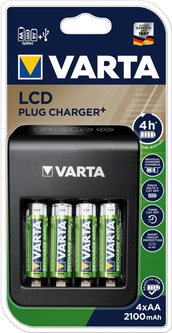 Der neue VARTA LCD Plug Charger+ ist kompatibel mit allen AA-, AAA- und 9V-NiMH-Akkus. Über den zusätzlichen USB-Ausgang können externe Geräte gleichzeitig geladen werden.