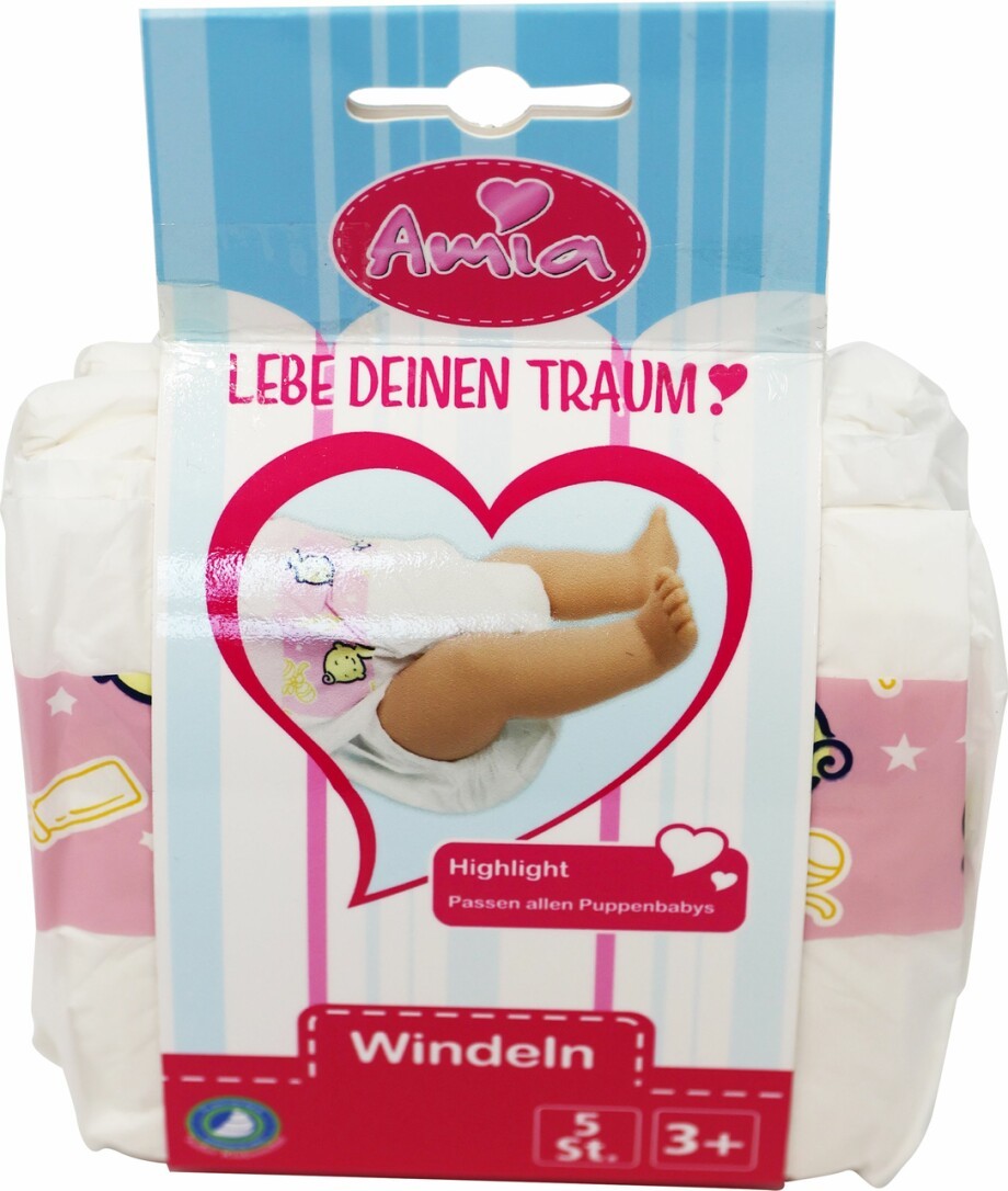 Die Amia Puppenwindeln sind für alle Puppen mit der Größe von ca. 30-42 cm geeignet. Aus Polyester. 5 Stück. Maße ca. 18x6x23 cm. Für Kinder ab 3 Jahren.