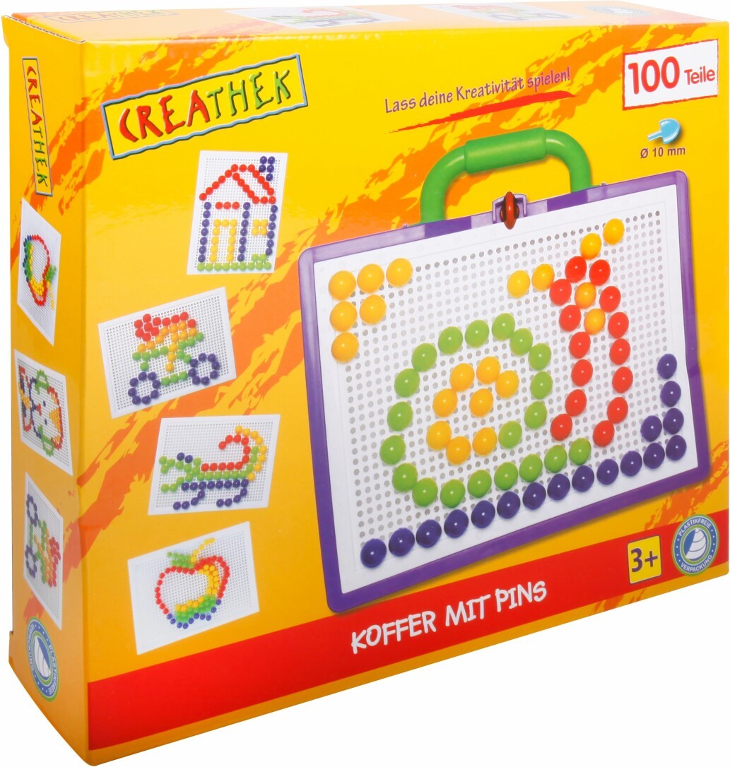 Creathek Koffer mit 100 Pins, Durchmesser 10 mm. Aus hochwertigem Kunststoff in leuchtenden Farben. Die Steckplatte ist auch gleichzeitig der Deckel des Koffers. Für Kinder ab 3 Jahren.