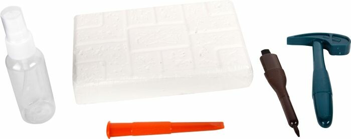 Dinosaurier Ausgrabungs-Set, 5 Teile. Enthalten sind ein Hammer, ein Meißel, eine Bürste, eine leere Sprühflaschen und ein großer Gips Block. Dieser ist in 10 kleine Gipsstücke unterteilt. Aus diesen kann ein Triceratops, Tyrannosaurus Rex oder Brachiosaurus ''ausgegraben'' und zusammengesetzt werden. Für Kinder ab 6 Jahren.