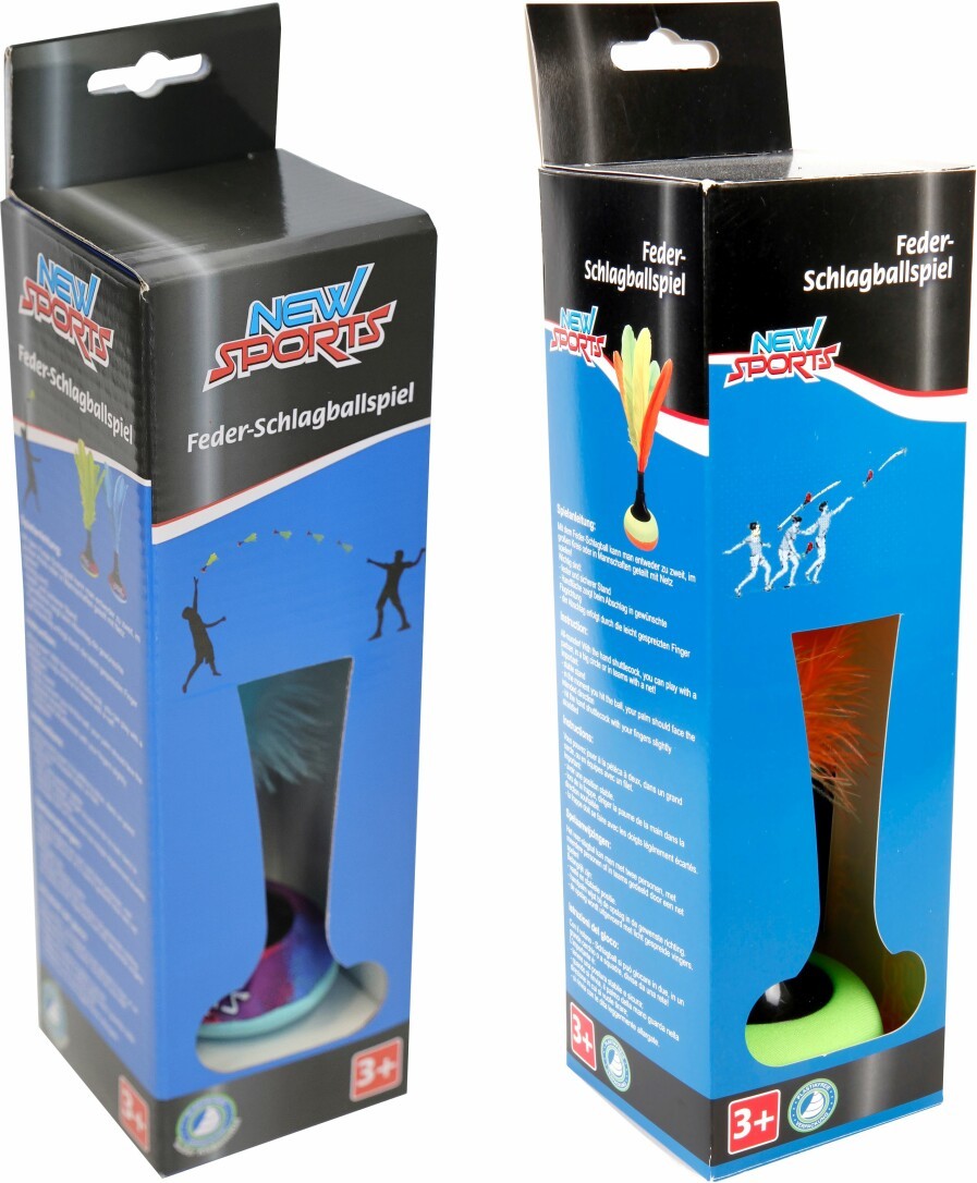 New Sports Handschlagballspiel mit Federn. Das Spiel wird mit zwei Mannschaften auf einem durch ein Netz getrennten Spielfeld gespielt wird. Der Indiacaball wird mit der flachen Hand geschlagen. Maße ca. 8x8x23 cm. Kinder ab 3 Jahren.