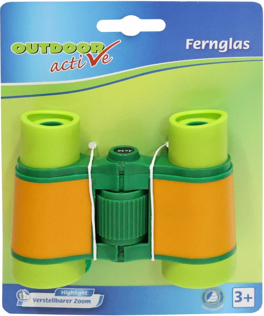Das Outdoor active Fernglas mit einer 4-fach Vergrößerung. Linsengröße ca. 30 mm. Linseneinstellabstand ca. 73-80 mm. Maße ca. 11x9x4 cm. Für Kinder ab 3 Jahren.