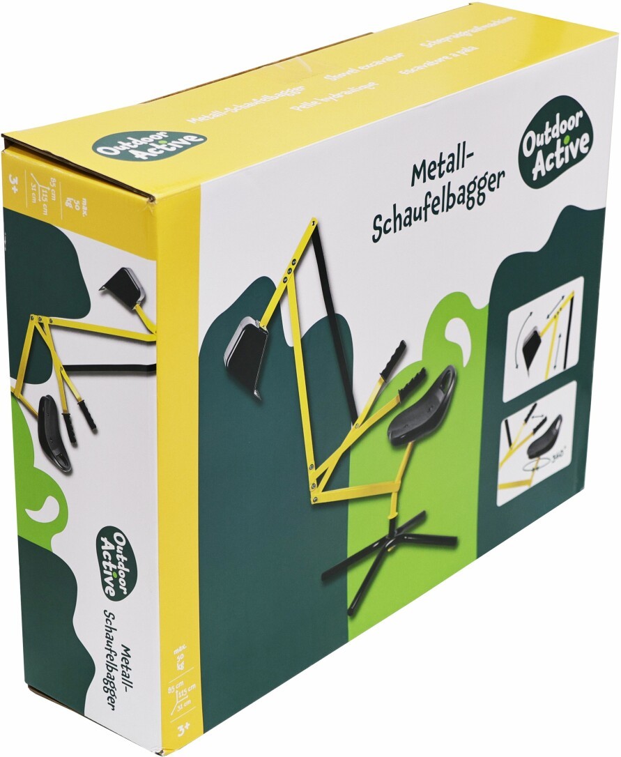 Outdoor active Metall Schaufelbagger gelb/schwarz. Aus hochwertigem Metall mit Kunststoffsitz. Der Bagger ist um 360 Grad drehbar und sorgt somit für jede Menge Aktion im Sand oder Garten. Maximale Belastbarkeit ca. 50kg. Maße: ca. 115x31x85cm. Für Kinder ab 3 Jahren.