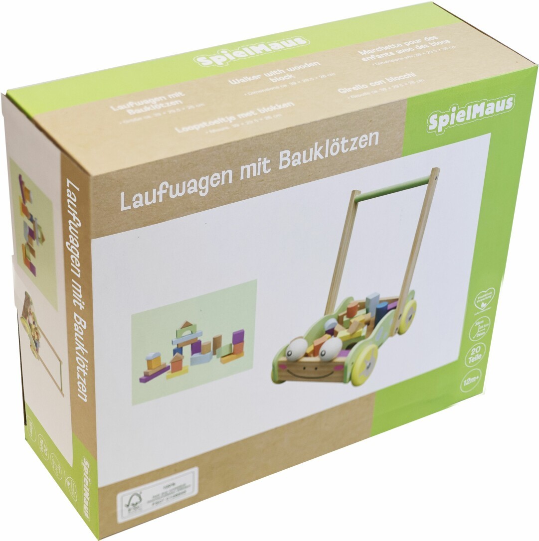SpielMaus Holz Laufwagen mit 20 Bauklötzen. Der Laufwagen unterstützt Babys bei ihren ersten Gehversuchen. Schubhöhe ca. 39 cm. Maße ca. 29x26x39 cm. Für Kinder ab 12 Monaten.