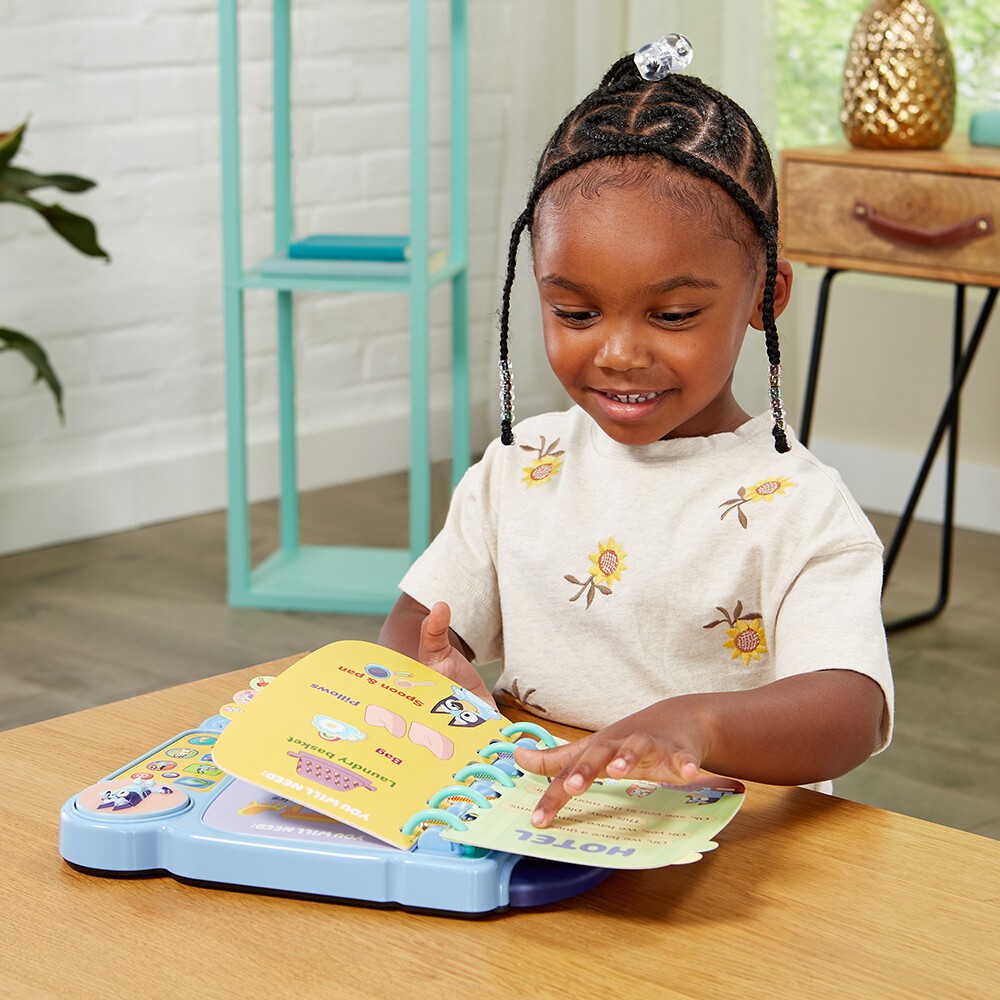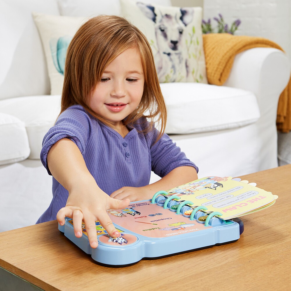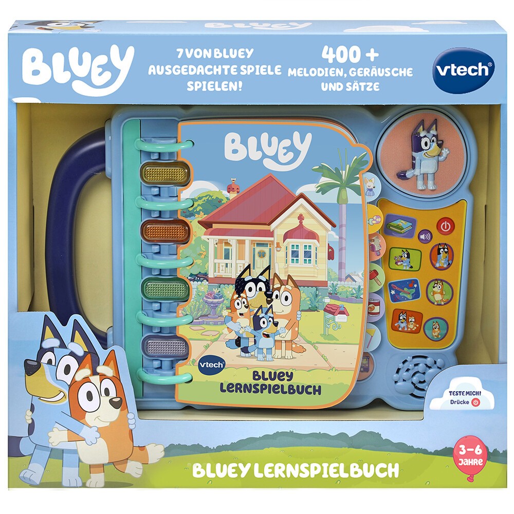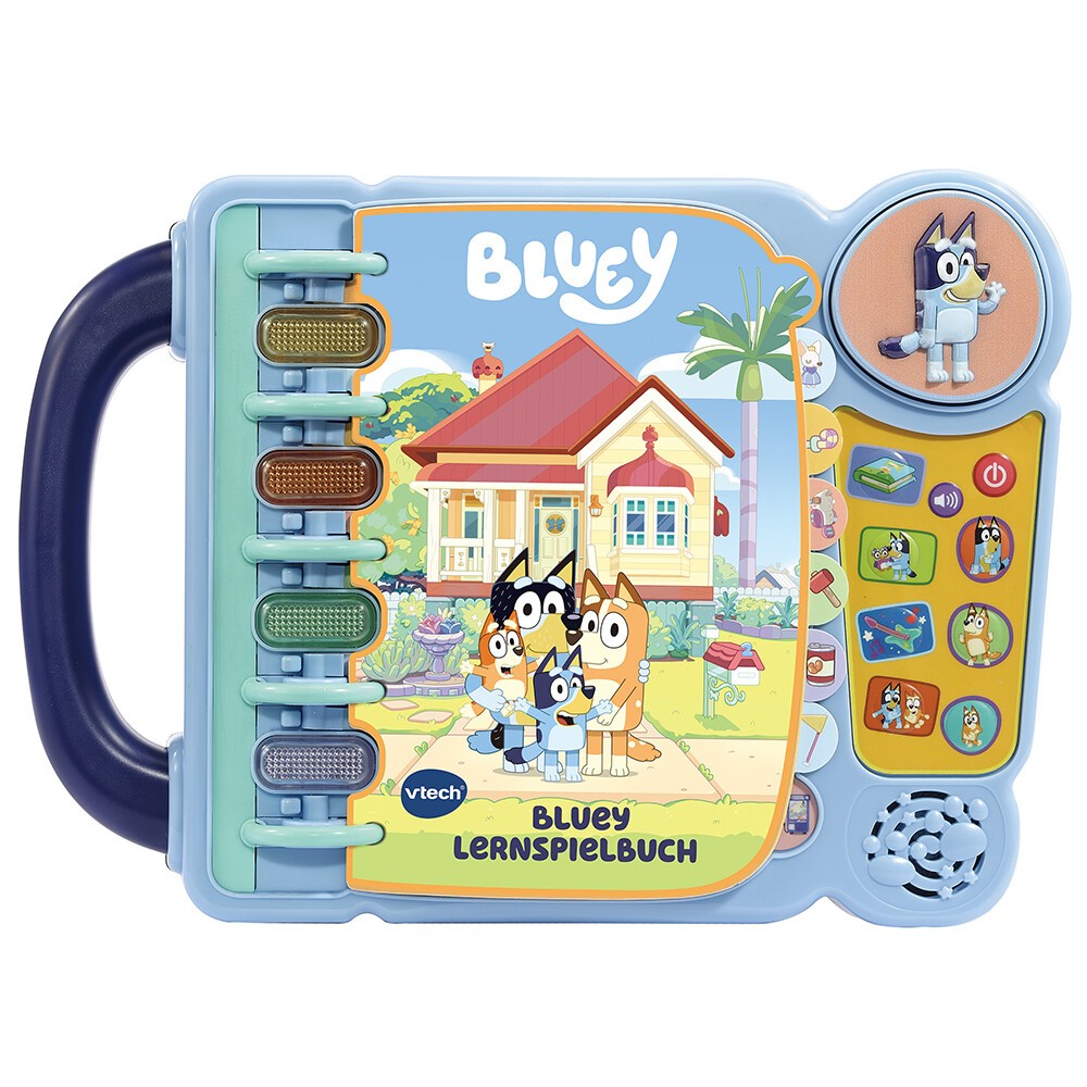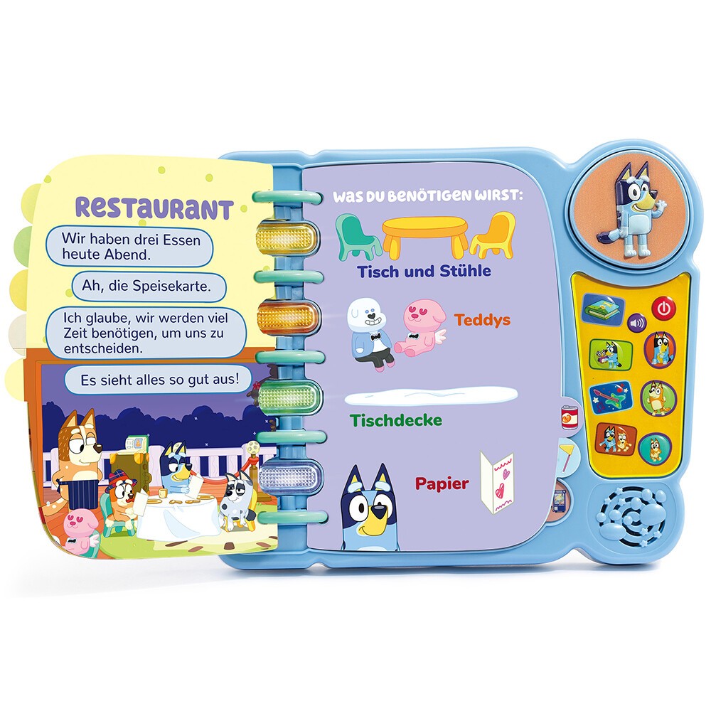 Endlich einmal selbst mit Bluey spielen! Interaktives Lernspielbuch aus der Welt von Bluey und ihrer Familie. Mit den Stimmen von Bluey und ihrer Schwester Bingo und Originalmusik aus der Serie. 4 Spielmodi: Geschichten, Zusammenspielen, Musik und Folgen. Rollenspiele mit Bluey und Bingo über den fantasievollen und lustigen Umgang mit den Gegenständen in ihrem Haus. 4 Figurentasten: Bluey, Bingo, Chilli und Bandit. 4 Leuchttasten für interaktive Spiele. Tragegriff an der Seite für Spielspaß unterwegs. Kindersicheres Batteriefach, Abschaltautomatik und Lautstärkeregler. Demobatterien sind enthalten.