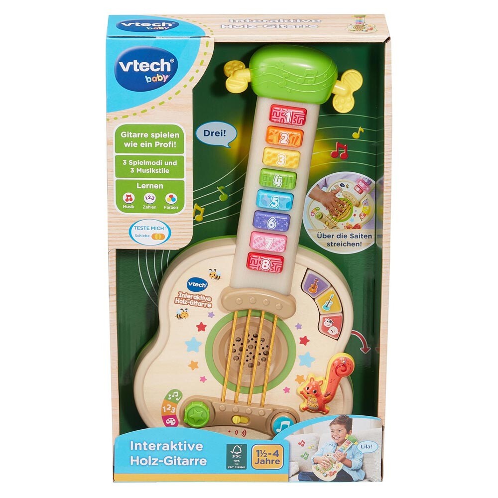 Kleines Kind, großer Rockstar! Mit der elektronischen Gitarre aus Holz kann nicht nur eigene Musik kreiert, sondern auch eine magische Lichtershow betrachtet werden. 3 Spielmodi, die per Modusschalter gewählt werden können: Formen, kreatives Spiel und Lichtershow. 8 bunte und aufleuchtende Tasten, die als Musiknoten dienen. 3 aufleuchtende Gitarrentasten zum Ändern der musikalischen Soundeffekte (Akkustik, Electro und Bass). 4 Gitarrensaiten. Die verschiedenen Tasten und Saiten lösen je nach Modus verschiedene Antworten zu Formen, Farben, Zahlen sowie Melodien und Lieder aus. 4 gesungene Lieder und zahlreiche vorinstallierte Melodien. Kindersicheres Batteriefach und Lautstärkeregler