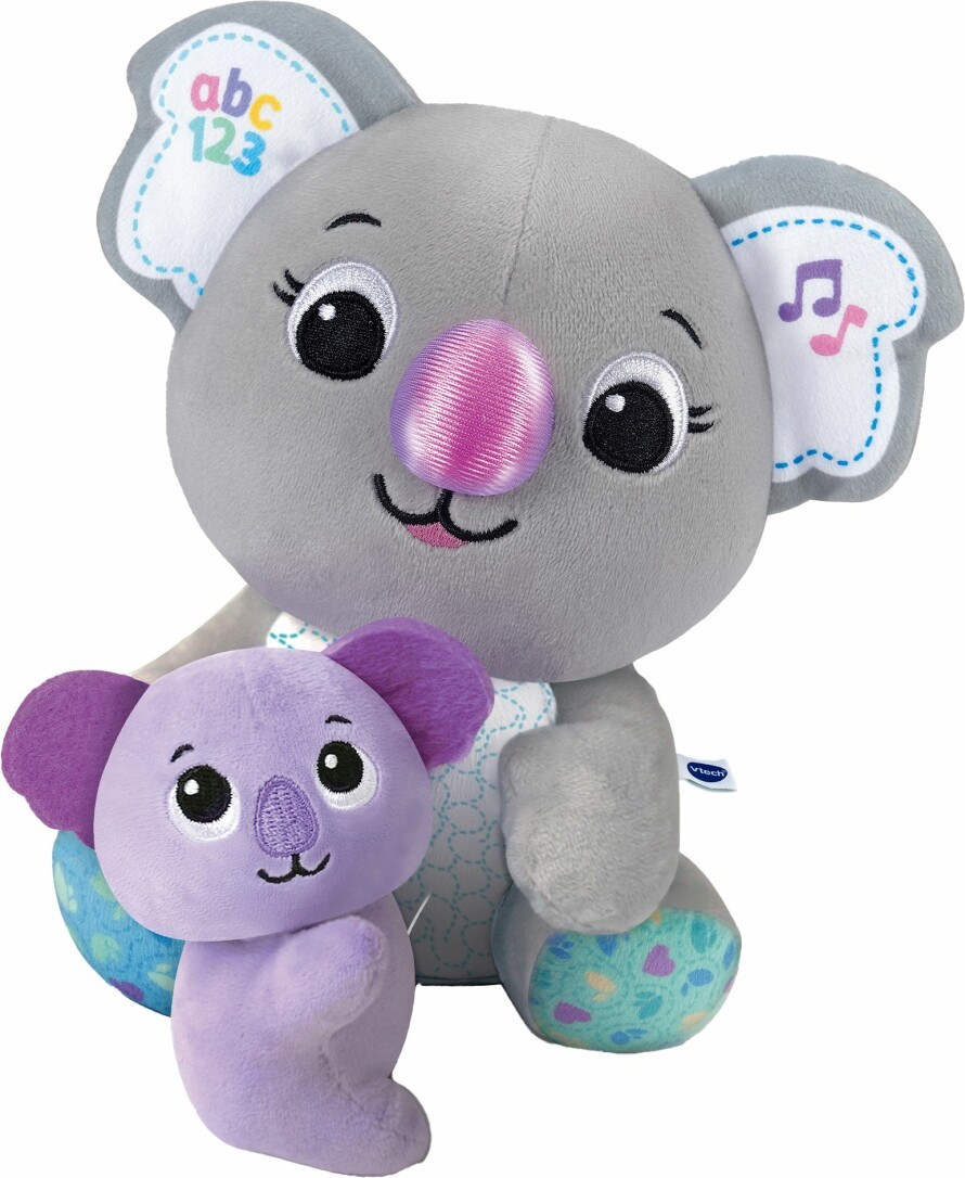 Buchstaben, Zahlen und Musik mit dem kuscheligen Koala-Duo lernen! Knuddel-Koalas aus Plüsch mit farbenfrohen und weichen Tasten, unterschiedlichen Oberflächen und Materialien zum Entdecken und Spielen. 3 Spielmodi zum Entdecken von Buchstaben, Zahlen und Musik. Das Koalababy ist mit einer herausziehbaren Schnur mit seiner Mama verbunden und reagiert mit süßen Sätzen, wenn an der Schnur gezogen wird. Die Schnur zieht sich automatisch ein und das Koalababy wird wieder in die Arme der Koalamama gezogen. Die Koalas singen Lieder, zählen zusammen und laden zu entspannendem Atmen ein. Lerninhalte: Buchstaben, Zahlen, Musik, taktile Wahrnehmung und Förderung der auditiven Wahrnehmung. Aufleuchtende Nase von Mama Koala leuchtet beim Sprechen und Singen. 4 bunte Tasten an den Ohren von Mama Koala lösen Inhalte zu den Themen Buchstaben, Zahlen, Emotionen und Musik aus. 5 gesungene Lieder. Über 100 Sätze, Lieder, Melodien und lustige Geräusche. Kindersicheres Batteriefach, Abschaltautomatik und Lautstärkeregler.