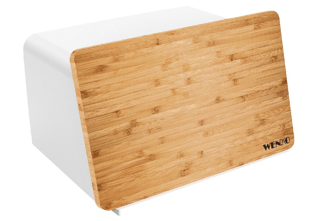 Mit der Brotbox mit Bambusbrett Kubo bietet WENKO eine dekorative Brotaufbewahrung, die in Sachen Design und Funktionalität absolut überzeugt. Das 3 in 1 Konstrukt hält Brot und Backwaren lange frisch, ist vielseitig einsetzbar und sieht dabei auch noch höchst elegant aus. Ein Brotkasten ist eines der Küchenutensilien, die in keiner Küche fehlen dürfen. Egal, ob zum Frühstück, als Zwischenmahlzeit oder zum Abendbrot – so eine Brotzeit kommt nie aus der Mode. Verübeln kann man es dem traditionellen Klassiker auch nicht, denn auf vielfältige Weise aufbereitet, trifft eine Brot-Mahlzeit absolut jeden Geschmack! Der aus hochwertigem ABS-Kunststoff gefertigte Brotkasten mit extravaganter Form wird zum absoluten Blickfang in Ihrer Küche! Das robuste Material ist pflegeleicht und eignet sich daher über alle Maßen für den Einsatz in der Küche. Im inneren überzeugt die geräumige Aufbewahrungsbox mit zwei Ebenen ebenfalls. Brot, Knäckebrot, Brötchen & Co. finden einen hier einen sicheren Platz und bleiben lange frisch, denn die Belüftungslöcher auf der Rückseite des Kastens sorgen für eine optimale Luftzirkulation. Das Bambusbrett verschließt den Brotkorb vorne, schützt vor Blicken und gewährleistet eine dunkle Lagerung Ihrer Backwaren. Das Brett aus Bambus lässt sich aber auch auf andere Weise gewinnbringend nutzen. Als Schneidebrett schneiden Sie hier komfortabel Brot und Baguette, als Servierplatte für Aufschnitt eingesetzt eignet sich der Haushaltshelfer ebenfalls – die Brotzeit ist angerichtet. Die Kombination aus schwarzem Kasten und Bambusbrett in Natur überzeugt auch optisch. Der formschöne Behälter schmiegt sich stilvoll auf Ihre Küchenarbeitsplatte und fügt sich bestens in Ihr bestehendes Interior ein. Gefertigt ist das Schneidebrett aus hochwertigem Bambus, welcher hart und widerstandsfähig ist. Auch unter ökologischen Aspekten bietet das Material klare Vorteile: Bambus ist ein schnell nachwachsender Rohstoff und liegt dank seiner Natürlichkeit absolut im Trend. Das Beste: Vor dem Schneidebrett lässt sich optimal ein Tablet oder ein Smartphone anlehnen. Auf diese Weise haben Sie Ihre Rezepte auf der Küchenzeile immer im Blick.
