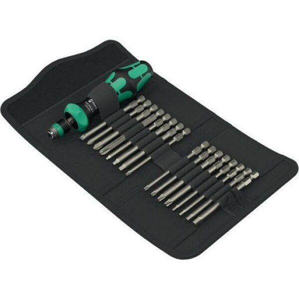 17-teiliges Set mit 89 mm langen Bits in praktischer Falttasche. Mit 1 Bit-Handhalter 838 RA-R L mit Ratschenfunktion. Die im Griff integrierte Ratsche mit Feinverzahnung sorgt für schnelles Arbeiten. Die innovative Ratschenmechanik ermöglicht das Zwirbeln, wenn die Schraube nur geringen Widerstand bietet. Das Umschalten der Schraubrichtung ist intuitiv: Wird der Ringschalter nach rechts gedreht, wird nach rechts geschraubt, wird der Ringschalter nach links gedreht, wird nach links geschraubt. Für präzise Arbeiten kann die Ratschenmechanik mit der 0-Position deaktiviert werden. Das Schnellwechselfutter Rapidaptor (geeignet für Bits mit 1/4 Zoll-Außensechskantantrieb nach DIN ISO 1173-C 6,3 und E 6,3 (ISO 1173)) ermöglicht blitzschnellen Bitwechsel ohne Hilfswerkzeug. 16 Bits (89 mm), zähhart, für den universellen Einsatz.