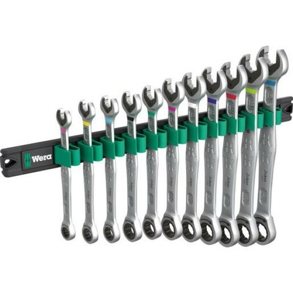 Der Ringratschen-Maulschlüssel Joker 6000 mit Haltefunktion für Sechskant-Schraubenköpfe bzw. -Muttern. Die auswechselbare Metallplatte im Maul sichert mit extra harten Zähnen Schrauben und Muttern. Der integrierte Endanschlag kann das Abrutschen vom Schraubenkopf nach unten verhindern und ermöglicht das Aufbringen hoher Drehmomente. Die Doppelsechskantgeometrie sorgt für die formschlüssige Verbindung mit Schraube oder Mutter und damit für die Verringerung der Abrutschgefahr. Ein Rückschwenkwinkel von nur 30 Grad auf der Maulseite vermeidet zeitintensives Wenden des Schlüssels beim Schrauben. Ratschenmechanik auf der Ringseite mit außergewöhnlich hoher Feinverzahnung von 80 Zähnen für Flexibilität auch in engen Bauräumen. Die spezielle Schmiedegeometrie sorgt für hohe Drehmomentübertragung und hohe Biegungssteifigkeit. Gefertigt aus leistungsfähigem Chrom-Molybdän-Stahl mit Nickel-Chrom Beschichtung für hohen Korrosionsschutz. Mit Werkzeugfinder Take it easy: Farbkennzeichnung nach Größen. Die Klemmen der Leiste sorgen für perfekten Halt der Werkzeuge.