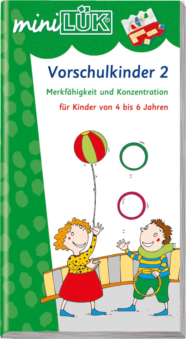 Übungen für Vorschulkinder 2. Spielreihen zu Merkfähigkeit und Konzentration. Vier- bis sechsjährige Kinder finden hier eine Vielzahl interessanter Aufgabenstellungen, die sie spielerisch mit Freude lösen können: Gegenstände zuordnen, fehlende Dinge ergänzen, kleine Knobelaufgaben lösen, Farben und Formen unterscheiden, Fehler entdecken. Eine ideale Vorbereitung auf die Grundschulzeit! Zur Bearbeitung dieses Übungsheftes benötigen Sie das miniLÜK-Lösungsgerät. Von 4 bis 6 Jahren.