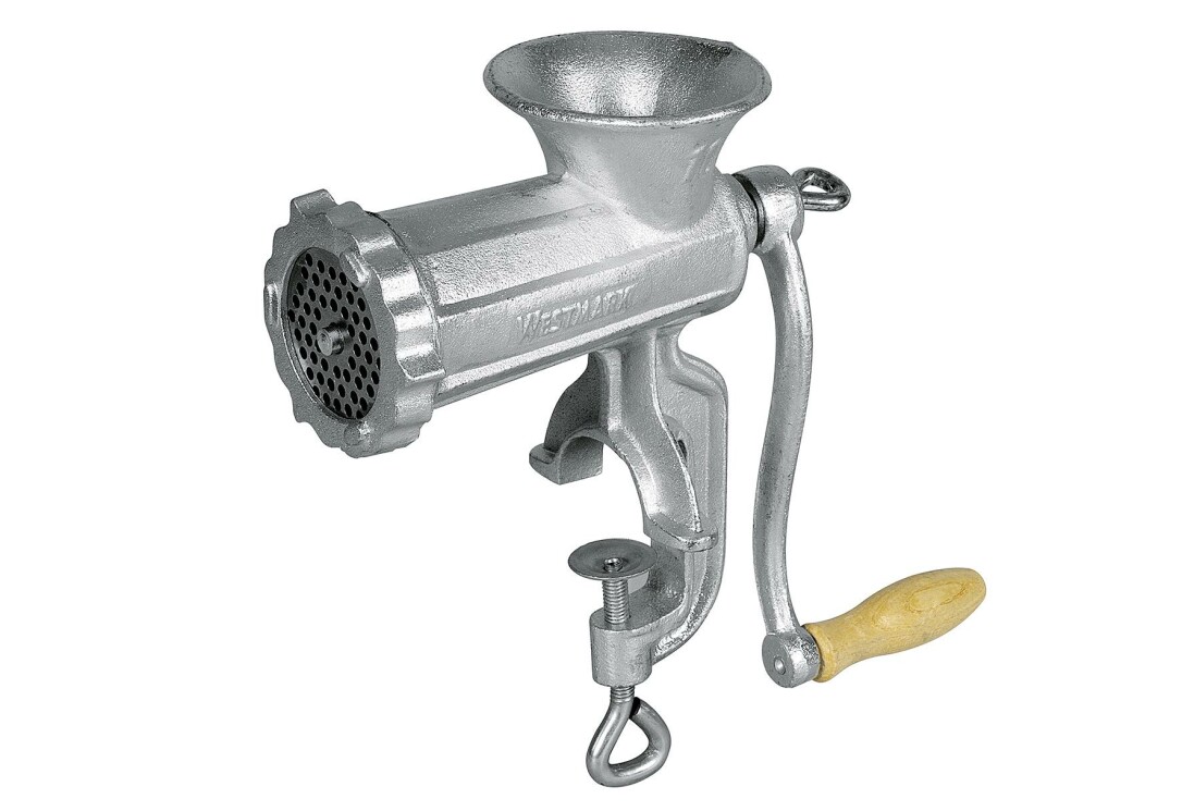 Der Fleischwolf Gr. 10 aus verzinntem Stahlguss ist perfekt, um kleinere Portionen herzustellen. Er verfügt über eine Lochscheibe (Lochgröße: Ø 4,5 mm), die sich mithilfe des leicht zu öffnenden Befestigungsrings ganz unkompliziert anbringen lässt. Das scharfe vierflügelige Messer zerkleinert Fleisch, Teig und sonstige Speisen im Nu. Der Fleischwolf ist ohne großen Kraftaufwand über eine Kurbel bedienbar und sitzt dank Montage per Schraubzwinge fest auf allen Tisch- und Arbeitsplatten. Die Kunststoff-Unterlegscheibe verhindert dabei das Verkratzen empfindlicher Oberflächen. Darüber hinaus ist der Fleischwolf in Einzelteile zerlegbar – für einfacheres Reinigen der Maschine.