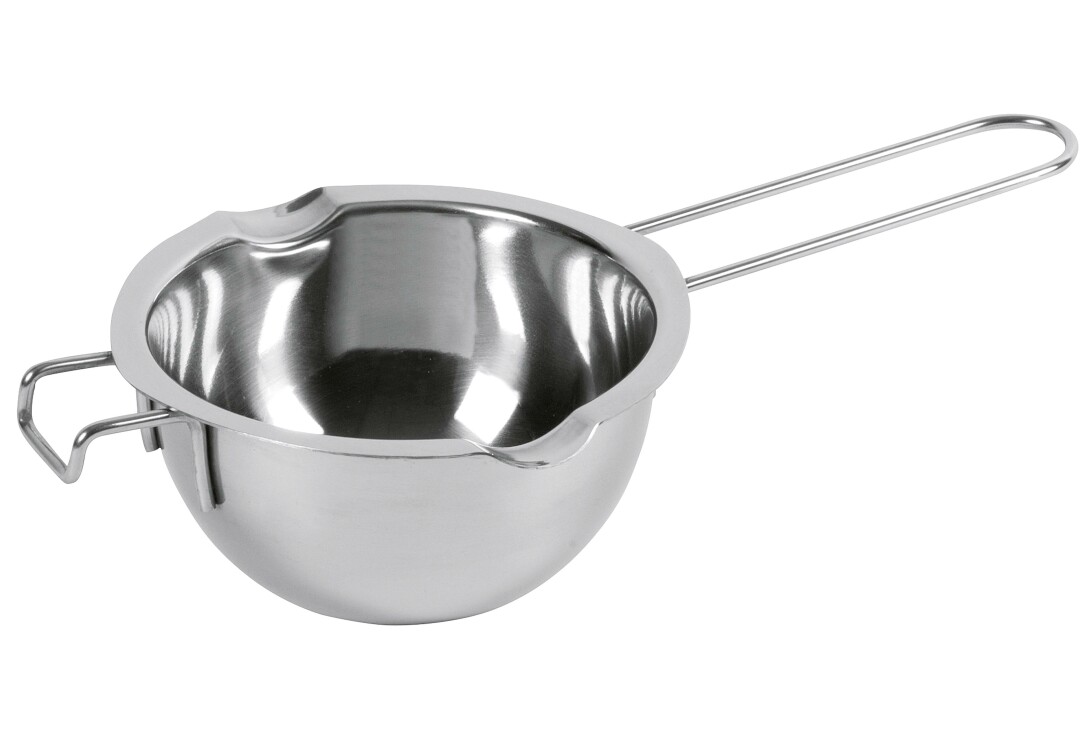 Die kleine Wasserbad-Schmelzschale (Innendurchmesser: 11 cm) mit Griff und Auflageraste ist zum Schmelzen von Schokolade oder Sugar Melt sowie zum Zubereiten von Soßen oder Eierspeisen gedacht. Ein Ausgießer auf jeder Seite macht sie für Rechts- und Linkshänder geeignet. Einfaches Einhängen der Schale mit Schokolade oder Sugar Melt-Drops in einen mit Wasser gefüllten Topf ist dank großer Auflageraste und langem Griff möglich. Die Schmelzschale ist bis 180 Grad hitzebeständig und die gute Handhabung ist durch den schmalen Griff aus rostfreiem Edelstahl gegeben. Dank abgeflachtem Boden ist sie bequem auf Tisch oder Arbeitsplatte abstellbar.