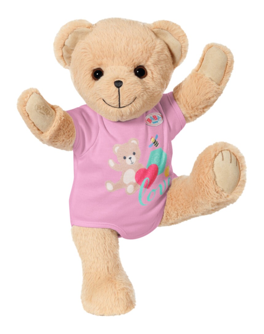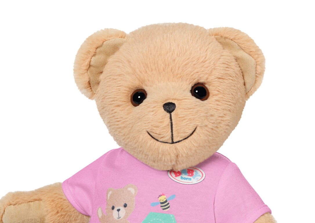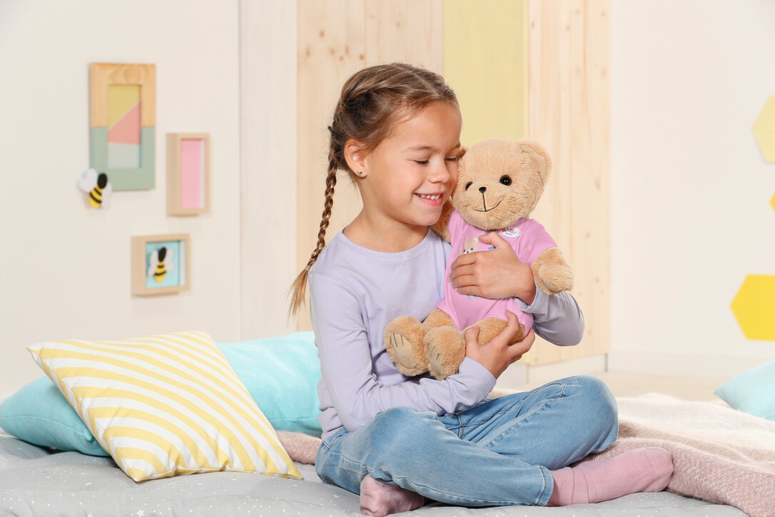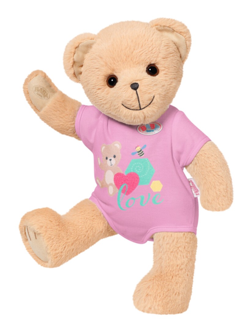 Der beste Freund für BABY born und alle BABY born Fans. Oder ist es vielleicht eine Freundin? Total egal, der Teddy kann alles sein: Mädchen, Junge, Baby, Kuschelbär, Spielkameradin, Trostspender, Prinzessin oder Feuerwehrmann und das von Kindesbeinen an, bis weit über das Puppenalter hinaus. Der kleine Bär mit dem süßen Lächeln hat einen weich gestopften Körper. Zu seiner Erstausstattung gehört ein pinker Strampler. Er hat eine eigene Fashion-Kollektion und bärige Accessoires, kann aber auch fast alles von BABY born anziehen und das Zubehör benutzen. Seine Figur ist so gestaltet, dass ihm nahezu alle Kleidungsstücke von BABY born 43cm passen. Nur die Schuhe, die passen ihm nicht. Aber welcher Bär braucht schon Schuhe? Durch die beweglichen Arme und Beine sowie den drehbaren Kopf, kann er einfach an- und ausgezogen werden. Seine Mobilität ist perfekt für vielfältiges (Rollen-)Spiel. Wer darf sich wohl als Erste*r ins Freundschaftsbüchlein mit extra Stickerbogen eintragen? P.S.: In der neuen Animationsserie von BABY born, ist Teddy natürlich auch dabei. Gemeinsam mit BABY born Emma und ihren Freunden erlebt er spannende Abenteuer. Schau gerne mal bei YouTube oder Toggolino vorbei!