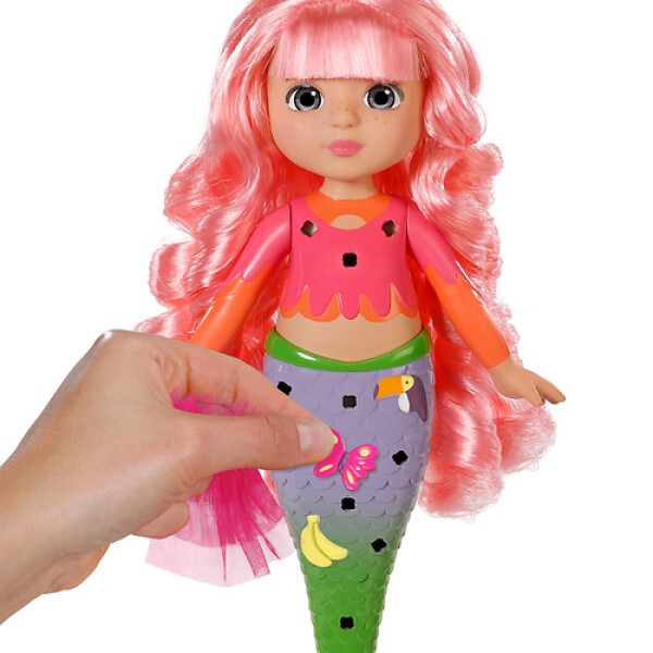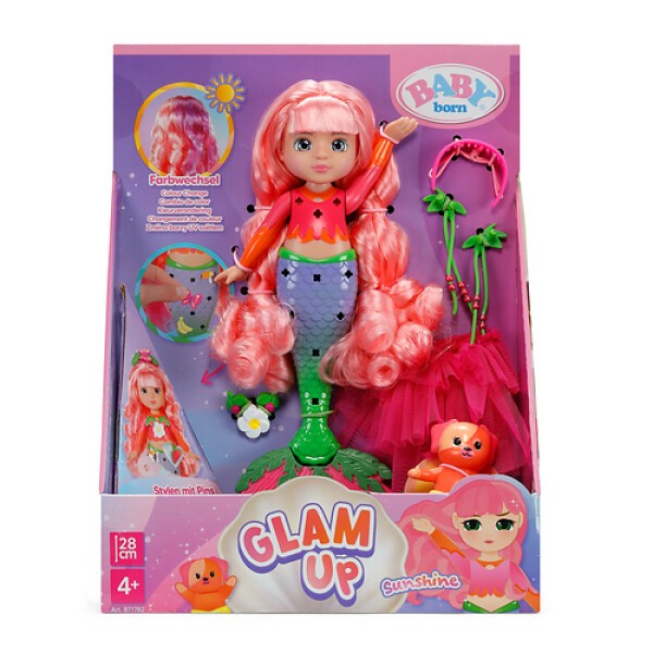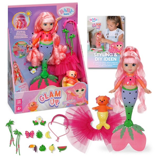 Magic Make Over Accessories: Kopftuch, Halskette, Bracelets, Rüschen mit verschiedenen Farben und Formen, Pins in verschiedenen Formen. Haustierfreund mit abnehmbarer Flosse und hochwertiges Haar mit langanhaltender Farbänderung durch UV Licht. Ab 4 Jahren.