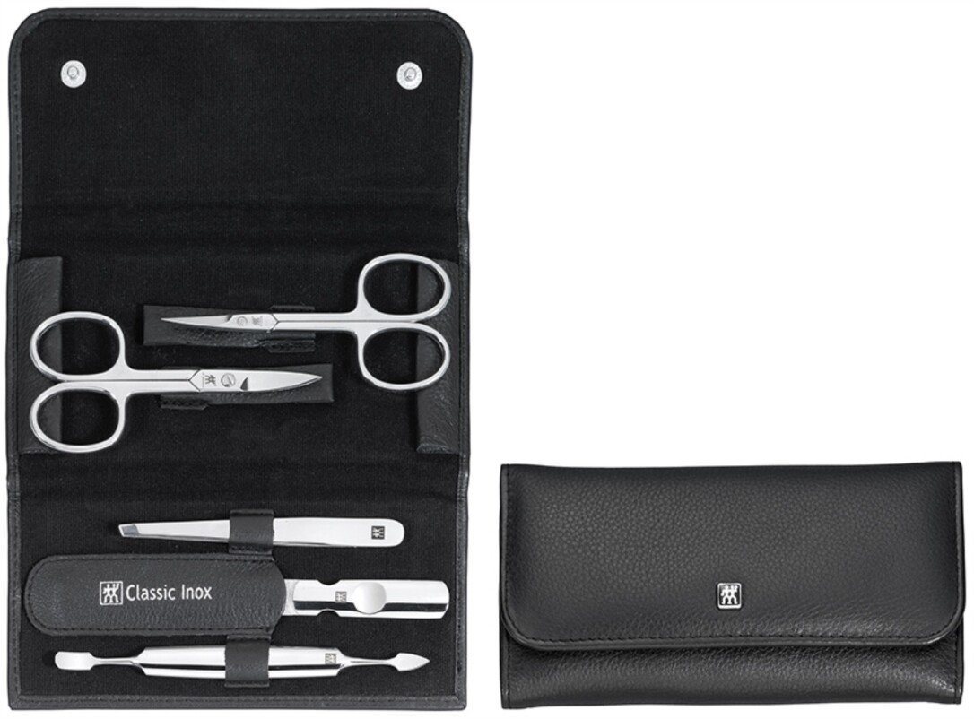 Lieferumfang: 1 Nagelschere, rostfrei, 1 Hautschere, rostfrei, 1 Pinzette, schräg, rostfrei, 1 Saphir-Nagelfeile, rostfrei, 130 mm, 1 Doppelinstrument, rostfrei, 1 Druckknopf-Etui, Rindleder, schwarz, 1 Beilegeleporello ZWILLINGINOX