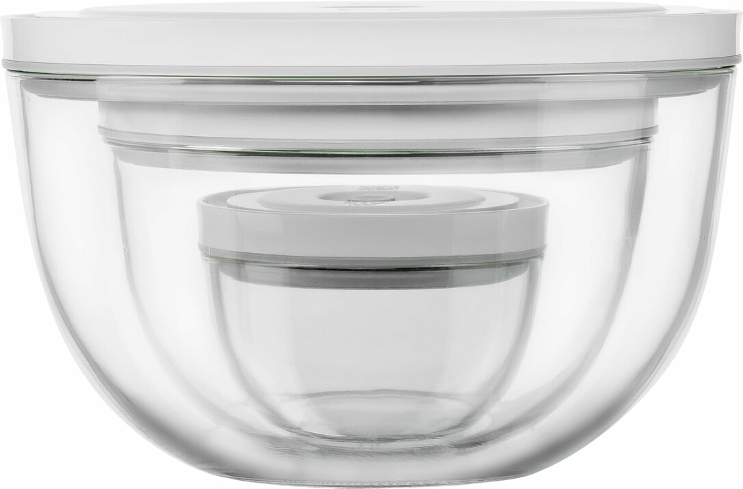LIEFERUMFANG:1x ZWILLING Vakuumschüssel-Set, 6-teilig, FRESH & SAVE BOWLS, 3 Schüsseln, Durchmesser: 12, 18 und 24 cm, Höhe: 8, 13, 16 cm, Material: Borosilikatglas (Behälter), BPA-freier Kunststoff (Deckel), Silikon (Ventil & Dichtung), Fassungsvermögen: 300, 1750 und 4000 ml, Gesamtgewicht: 3485 g, 1031016. Für die Vakuumfunktion wird eine separat erhältliche ZWILLING FRESH & SAVE Vakuumpumpe benötigt. Diese ist nicht im Lieferumfang enthalten.
