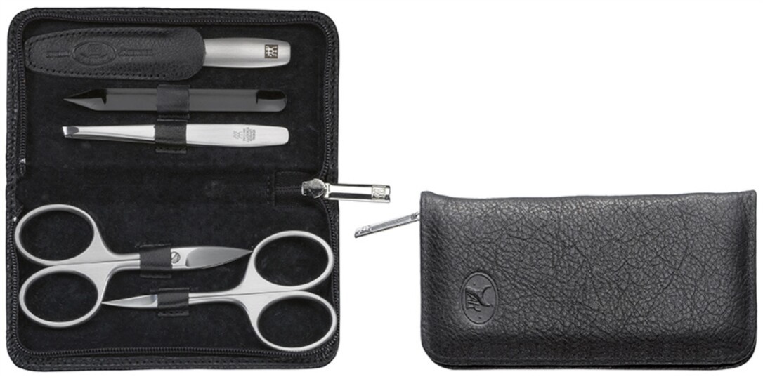 Elegant und schlicht in das 5-teilige Maniküre-Set aus der Serie TWINOX. Es enthält all das, was Sie für die Nagelpflege benötigen. In dem Reißverschluss-Etui aus schwarzem Yakleder finden die hochwertigen Instrumente Platz.