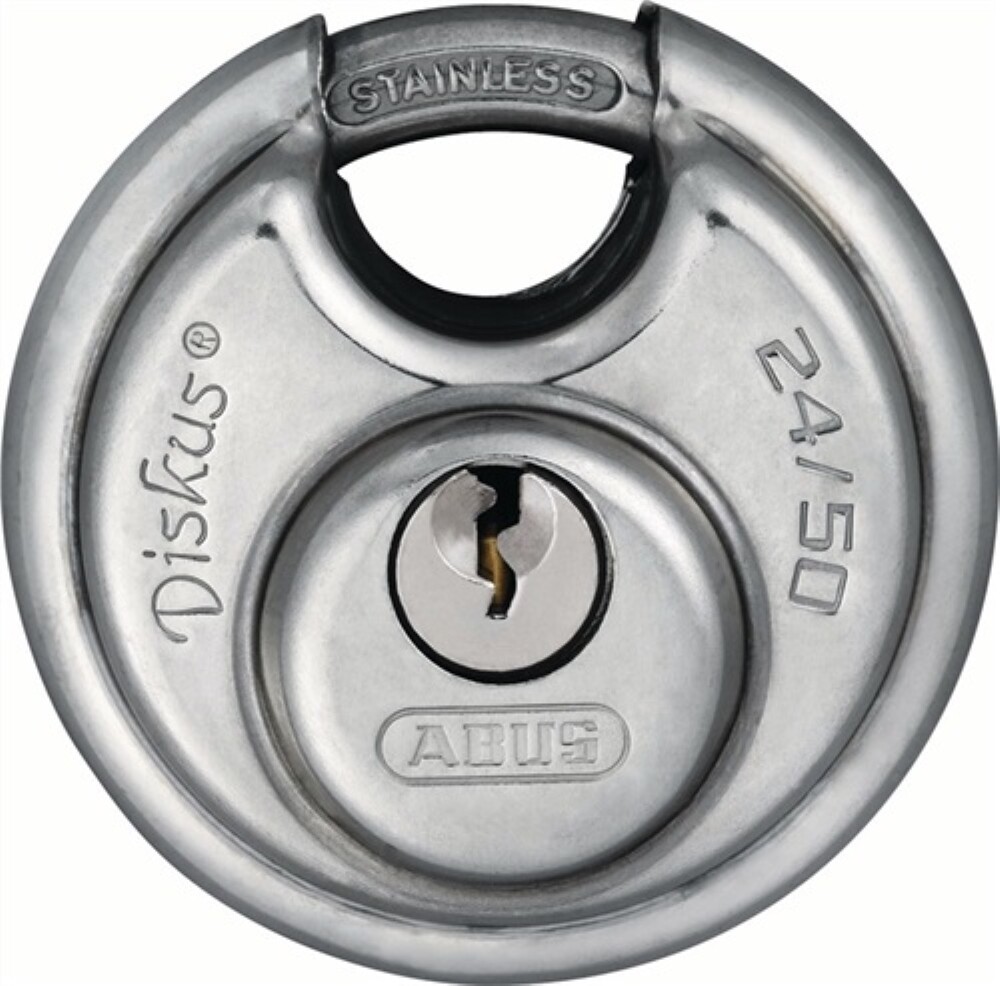 The shape of the Diskus lock provides effective protection against the most common ways of gaining entry. The design of the small shackle opening means there is hardly any space for attacks on the shackle. As the Diskus lock is made primarily of stainless steel, it is used particularly where security and protection against corrosion are required. Trucks, doors, gates, barns, cellars, sheds, etc., can all be locked with the ABUS Diskus 24IB. Should ideally be used with an ABUS Diskus hasp so the lock shackle cannot be attacked with tools.