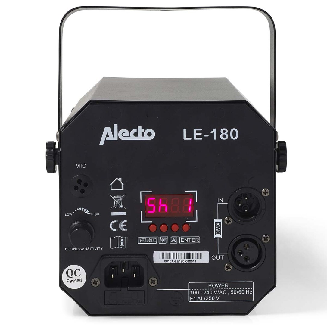 • DMX-Ein- und Ausgang. Zum Anschluss mehrerer LE-180s oder zum Anschluss einer DMX-512 SteuerungEine echte Party braucht gute Musik und eine professionelle Partybeleuchtung. Die LE-180 LED-Discolampe ist genau das Richtige für Sie. Die Discolampe hat neben einem Stroboskop eine Reihe anderer Effekte integriert. Sie können aus einem der acht vorprogrammierten Effekte auswählen oder Ihren eigenen Effekt einstellen. Zusätzlich können Sie die Lampe an Musik anschließen und mit weiteren Discolampen verbinden.Die LE-180 kann die Geschwindigkeit an die Umgebungsgeräusche anpassen Auf der Rückseite der Discolampe können Sie die Empfindlichkeit des Sensors selbst einstellen.Lieferumfang• LE-180 Discolampe