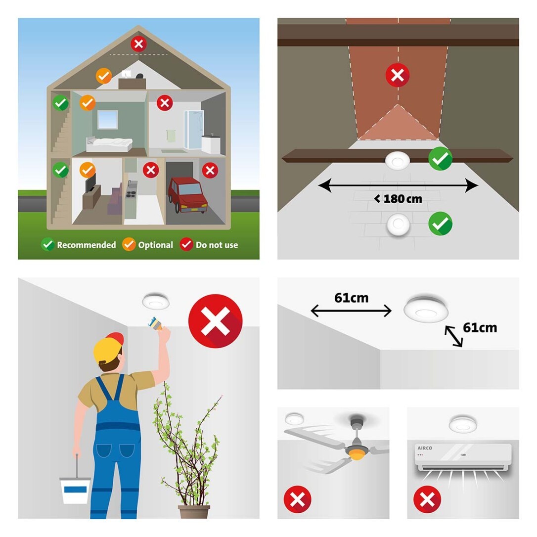 Die Installation in Küchen, Kellern, Dachböden und Bädern ist grundsätzlich nicht empfehlenswert. Wasserdämpfe und Staubpartikel führen in vielen Fällen zu Fehlalarmen, was die Lebenszeit der Rauchmelder reduziert und die Bewohner des Hauses unnötig unter Stress setzt. Eine Alternative ist die Installation eines Hitzemelders.
