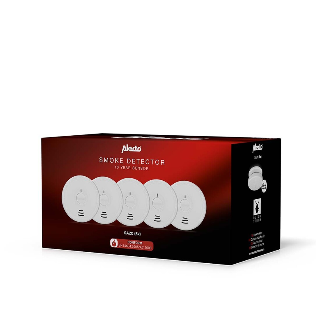 Ein preiswerter Rauchmelder für Ihr ZuhauseSchnelle Alarmierung bei Rauch und Feuer, auch im Schlaf.Timeout-Taste (schaltet den Alarm für 10 Minuten aus).Hohe Qualität: entspricht der EN14604:2005/AC:2008.SA20 5x: Set von fünf Rauchmelder SA20Extra lauter Alarm >85dB.Guter Brandschutz muss nicht teuer sein. Der SA20 von Alecto beweist das. Für den kleinstmöglichen Preis erhalten Sie ein Stück Sicherheit im Haus, das nicht fehlen sollte. Einmal installiert, warnt dieser Rauchmelder jeden im Haus mit einem lauten, unüberhörbaren Ton, wenn eine Brandsituation eintritt.Dieser günstige Rauchmelder ist zwar nicht teuer, hat aber trotzdem alle Qualitäten, die Sie suchen:Erfüllt die Norm EN 14604, die speziell für Rauchmelder entwickelt wurde.Mit seinem optischen Messprinzip reagiert er sofort auf einen Brand. Dies gibt Ihnen und Ihren Angehörigen so viel Zeit wie möglich, das Gebäude zu verlassen und die Rettungsdienste zu alarmieren.Ist einfach zu installieren. Alle Befestigungsmaterialien und die Batterie sind im Lieferumfang enthalten.Gibt eine Warnung aus, wenn die Batterien ausgetauscht werden müssen.Besitzt eine Testtaste.Taste für temporäres AusschaltenEs gibt Situationen oder Anlässe bei denen Sie den Rauchmelder vorrüber gehend abschalten wollen/müssen. Zum Beispiel, wenn Sie eine Steingrillparty in Ihrem Haus veranstalten. Oder Sie veranstalten eine Party und es sind viele Raucher in der Gruppe. Der SA20 verfügt über eine praktische Time-Out-Taste, mit der Sie den Melder ausschalten können, wenn die Situation es erfordert.Günstiger Rauchmelder, komplett geliefert Der Rauchmelder wird mit einer alkalischen 9V-Batterie geliefert, die eine lange Lebensdauer hat. Die Bodenplatte zur Montage des Rauchmelders an der Wand oder Decke ist ebenfalls im Lieferumfang enthalten, ebenso wie die notwendigen Schrauben und Dübel. Ob Sie ihn also an einer Holzdecke oder einer Ziegelwand befestigen wollen, alle Materialien sind im Lieferumfang enthalten. Mit Alecto entscheiden Sie sich für ein gut durchdachtes und benutzerfreundliches Produkt von hoher Qualität.Lieferumfang:Rauchmelder 5x