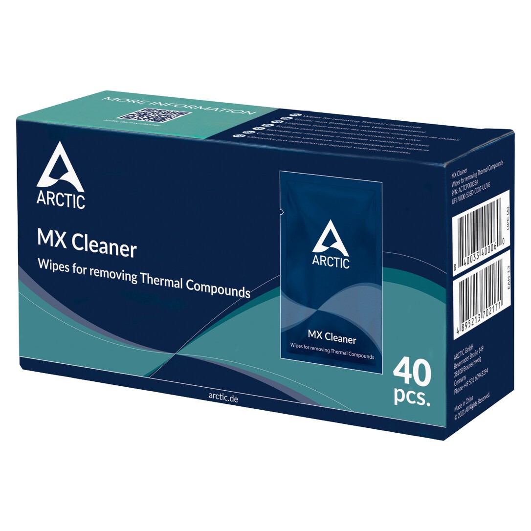 ARCTIC MX Cleaner - Reinigungstücher zum Entfernen von Wärmeleitpaste (40 Stück). Typ: Thermischer Fettentferner, Beste Verwendung: CPU, Kühlkörper. Menge pro Packung: 40 Stück(e), Verpackungsbreite: 52 mm, Verpackungstiefe: 147 mm. Ursprungsland: Hong Kong