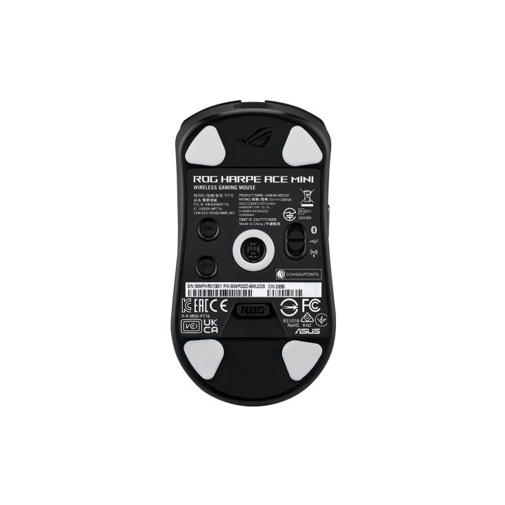 ASUS ROG Harpe Ace Mini. Formfaktor: Beidhändig. Bewegungerfassungs Technologie: Optisch, Geräteschnittstelle: RF Wireless + Bluetooth + USB Type-C, Bewegung Auflösung: 42000 DPI, Scroll Typ: Rad. Energiequelle: Batterien / Kabel. Produktfarbe: Schwarz