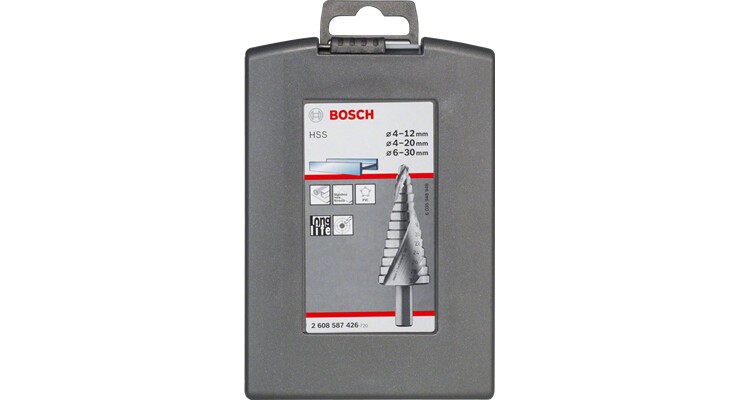 Bosch 2608587426 HSS Stufenbohrer-Set 3teilig 4 - 12 mm 4 - 20 6 - 30 mm - Kunststoff - Metall - Nicht-eisenhaltige Metalle Schaft-? 6 / 8 /10mm - Standard-Bohrfutter - Schnellspann-Bohrfutter 3 -teilig