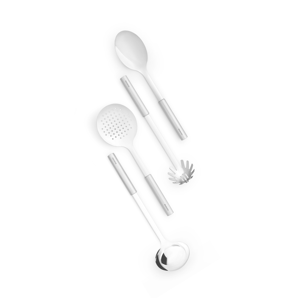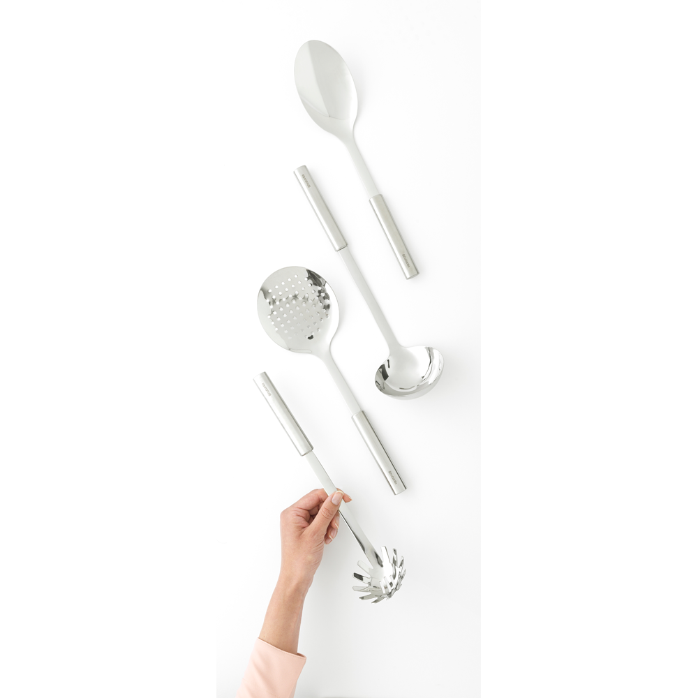 All your favourite stainless steel kitchen helpers in one set for the real home chef. This high-quality Profile Kitchen Utensils Set consists of a Soup Ladle, Vegetable Spoon, Spaghetti Spoon and Skimmer. Pure simplicity in your kitchen.