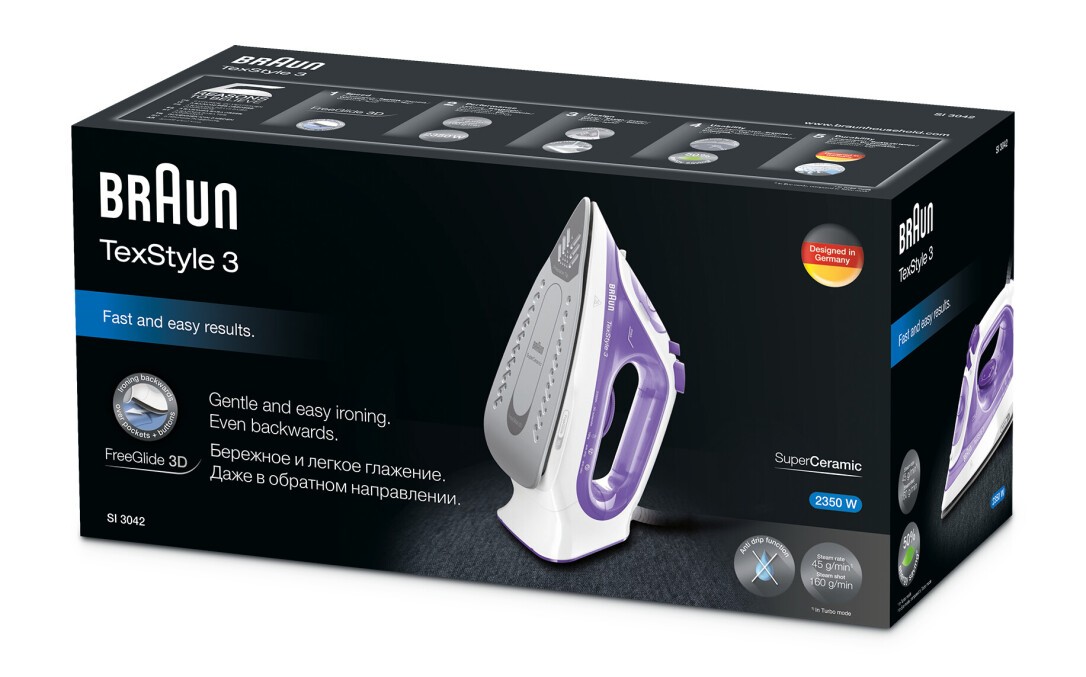 Braun TexStyle 3. Type: Dry & Steam iron, Cord length: 2 m, Steam boost performance: 160 g/min. Power: 2350 W, AC input voltage: 220 - 240 V, AC input frequency: 50 - 60 Hz