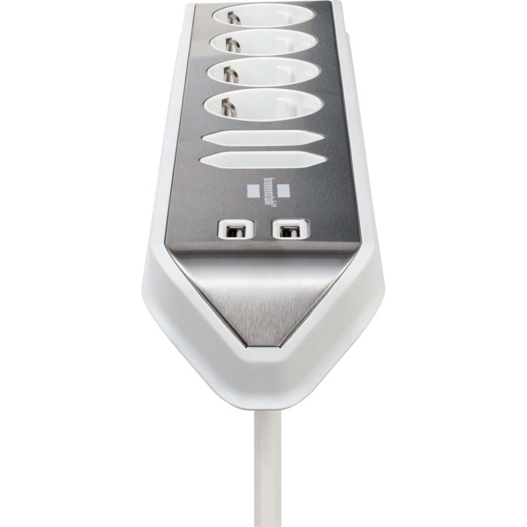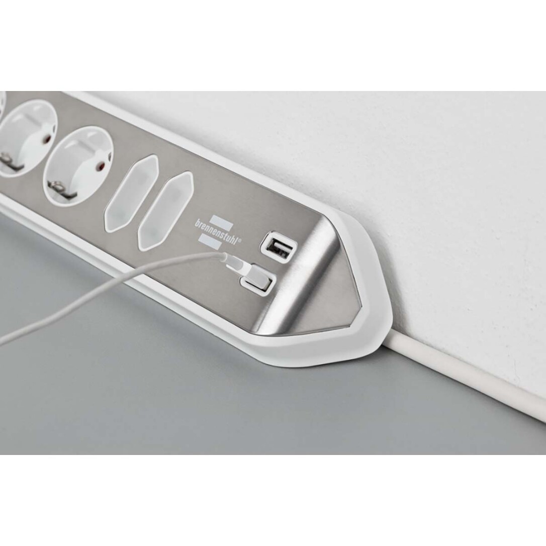 Brennenstuhl Estilo Eck-Steckdosenleiste 6-fach mit hochwertiger Edelstahloberfläche für Küche und Büro (Tischsteckdose mit 4x Schutzkontakt-Steckdosen, 2x Euro-Steckdosen, inkl. USB-Ladefunktion) Silber / Weiss TYPE F
